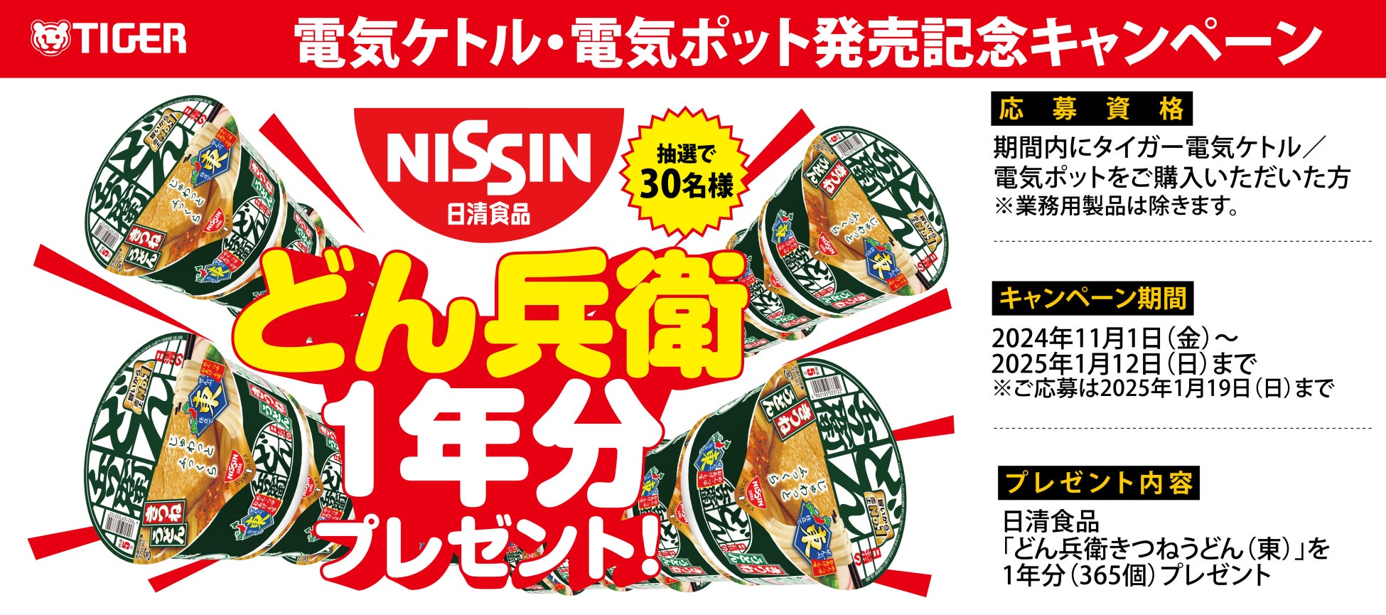 熱制御テクノロジーで世界をリードするタイガー魔法瓶株式会社(社長:菊池嘉聡、本社:大阪府門真市)は、タイガー魔法瓶の電気ケトルもしくは電気ポットを2024年11月1日から2025年1月12日までにご購入いただいた方を対象に、日清食品「日清のどん兵衛 きつねうどん[東]」1年分(365個)が30名様に当たるキャンペーンを実施いたします。