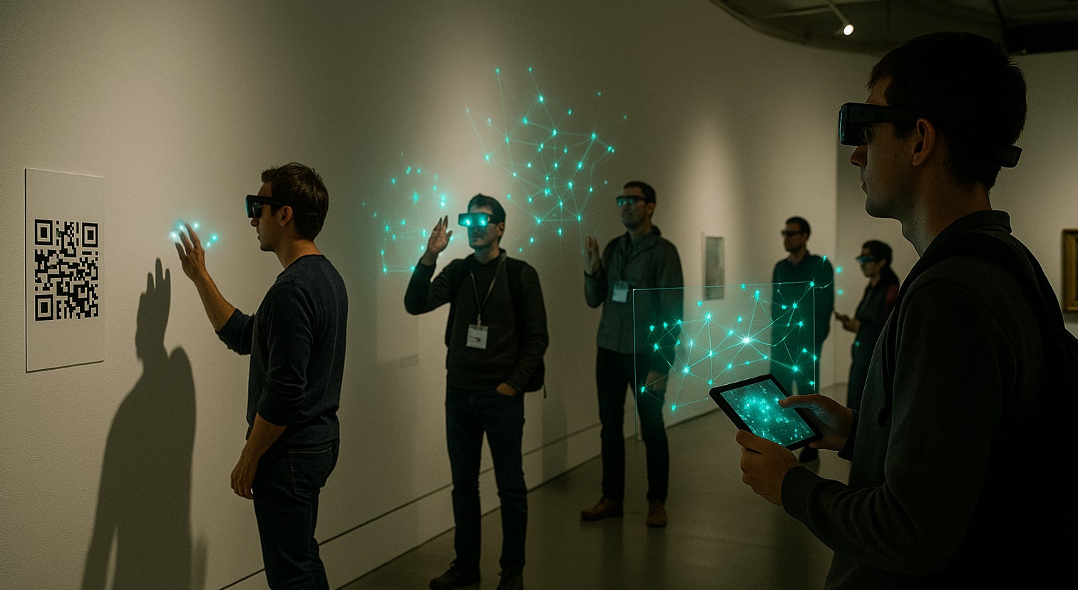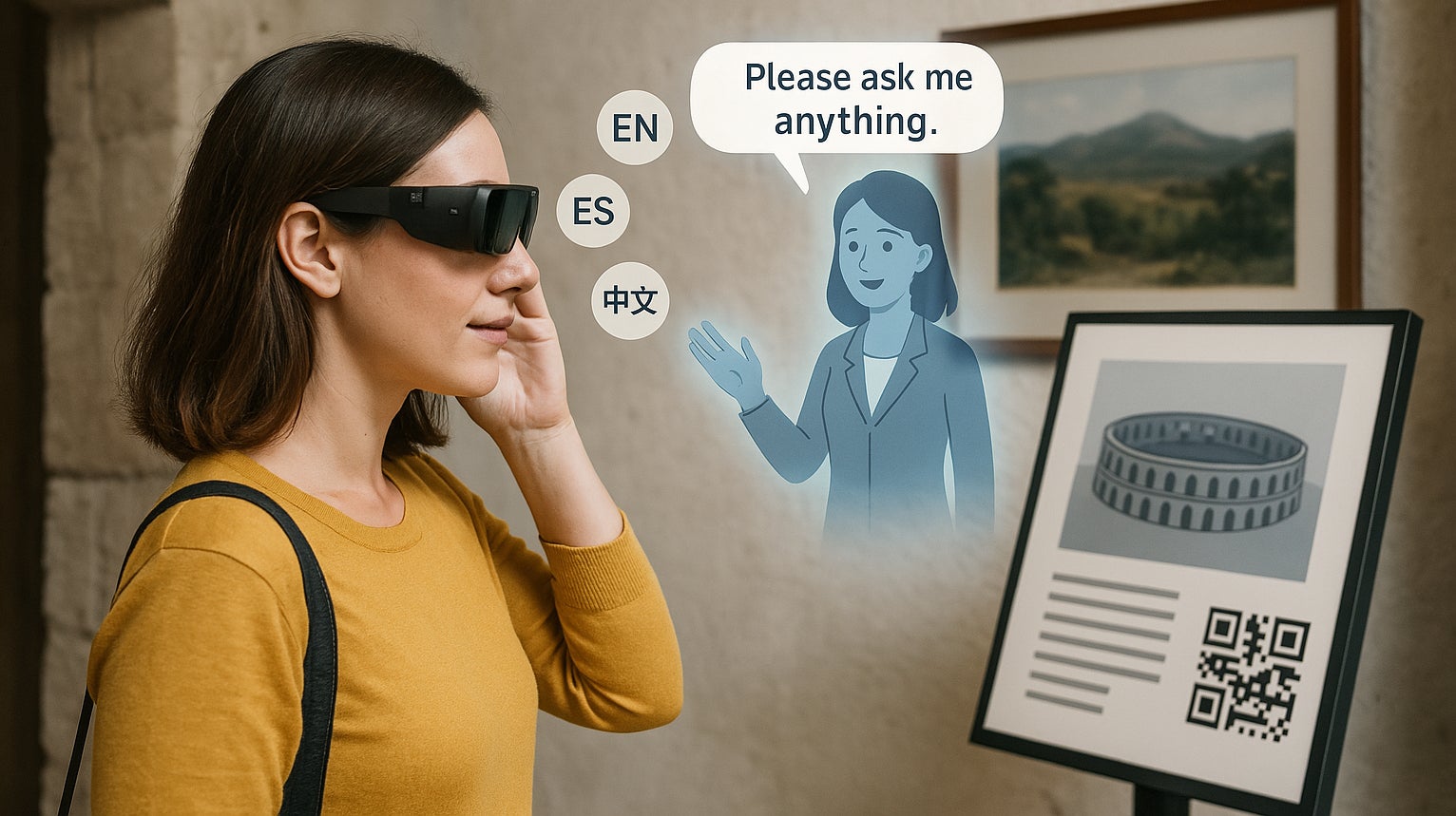 観光地・博物館・美術館などで、展示パネルやパンフレットなどにQRコードを設置。ARグラスをかけながら展示を周り、パネルを見るとAI搭載型バーチャルアシスタントが出現し、地域や展示品の説明を行います。