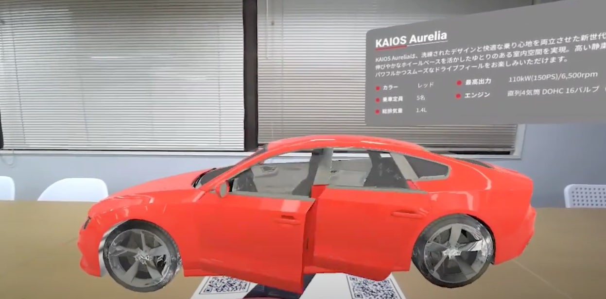 「試せるARカタログ 」は、ARグラスをかけた状態で、カタログに印刷されたQRコードを見るだけで、3Dモデルの製品が空間に表示され、細部の確認や試し置きができるソリューションです。