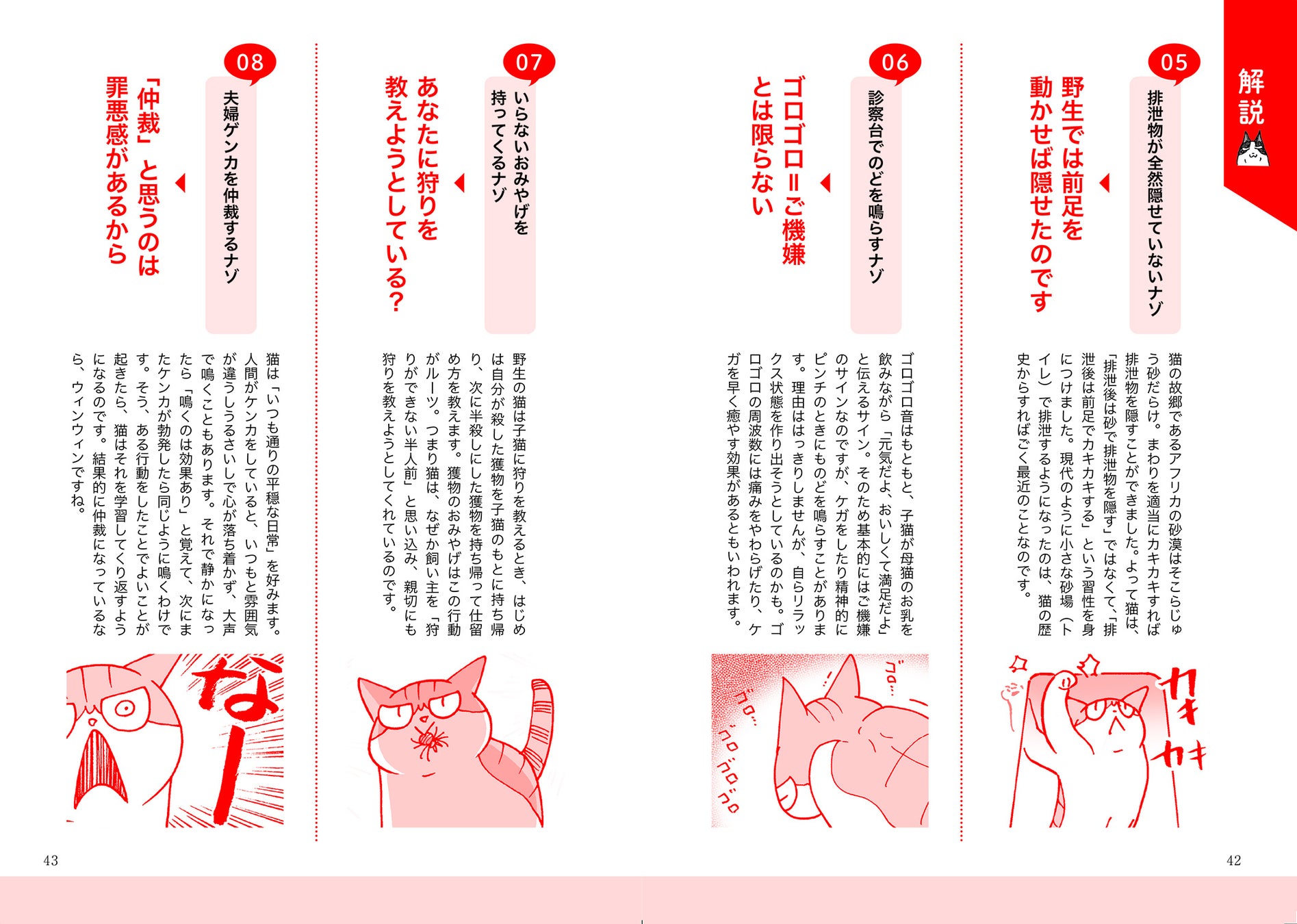 「風呂やトイレについてくるナゾ」「人がなでたところをなめるナゾ」「あらぬところを凝視するナゾ」など、思わず「わかる!」と頷いてしまうエピソードが全部で40、たっぷりと詰まっています。くるねこ大和さんならではの温かくユーモラスな視点でいきいきと描かれる猫たちの姿は、猫好きならだれもが共感すること間違いなし!