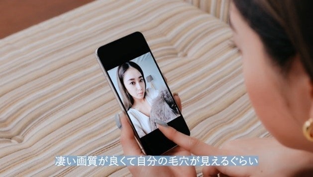 メイキングではみちょぱさんと愛犬ぐみちゃんがまるで家に居るかのように、まったりかつ和気あいあいとした雰囲気で撮影が行われました。慣れない環境でぐみちゃんがなかなか落ち着かず走り回ってしまい、みちょぱさんが呆れてしまう様子や、おやつでぐみちゃんの気を引き、上手く撮影に成功する様子まで映されています。また、ハイグレードなカメラ機能に感動し、ぐみちゃんと楽しく自撮りをする微笑ましいお2人の姿や、春らしく背中が大胆にあいたロングワンピースを見事に着こなしているみちょぱさんの最新春ファッションにも注目です。