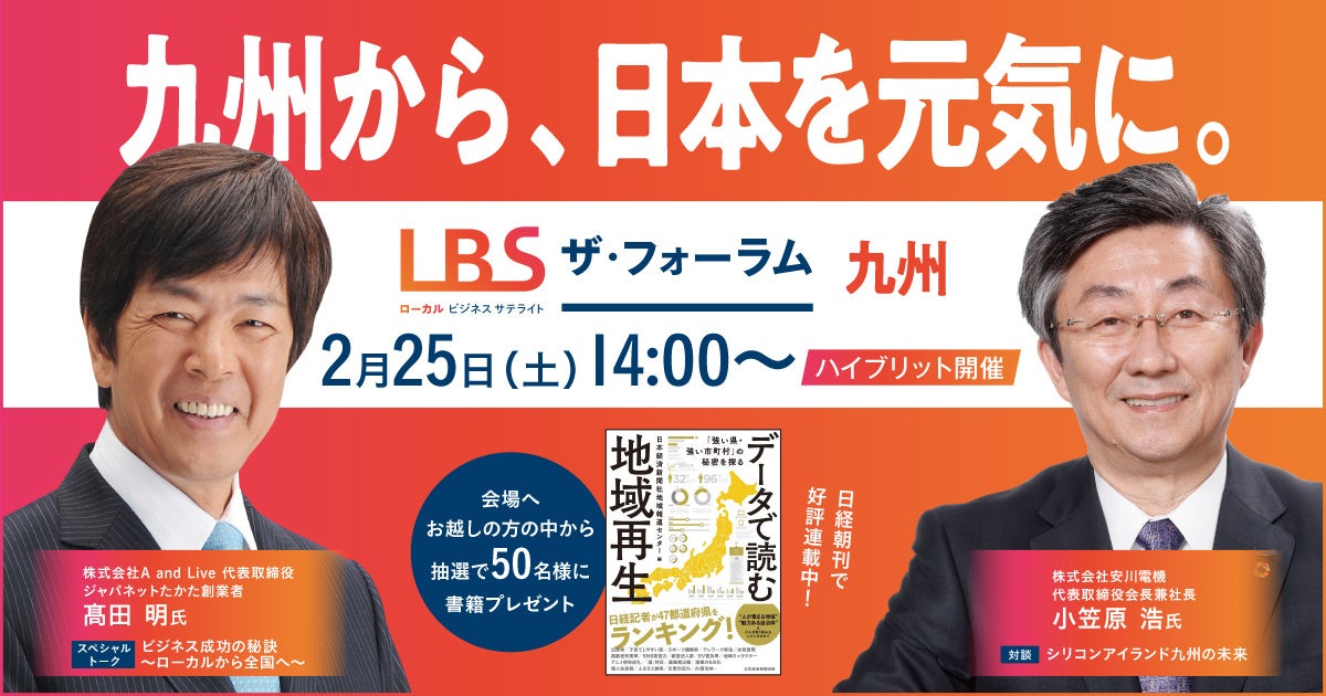 大阪、名古屋に続く3回目の開催となる「LBSザ・フォーラム」は、ジャパネットたかた創業者の髙田明氏の講演のほか、半導体生産拠点として再び沸く「シリコンアイランド九州の未来」を安川電機会長兼社長の小笠原浩氏と日本経済新聞社のコメンテーターが徹底討論します。サテライト会場は、札幌、広島の計2会場にてフォーラムの内容をリアルタイムで上映いたします。