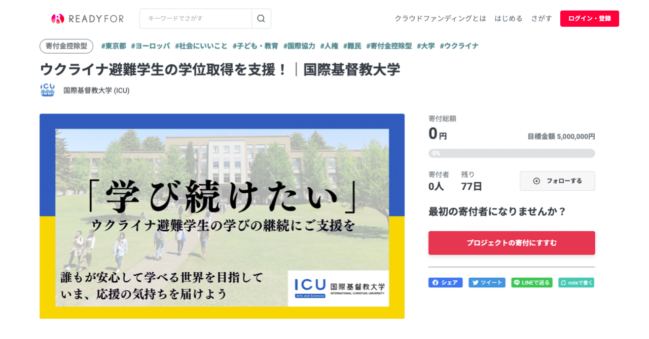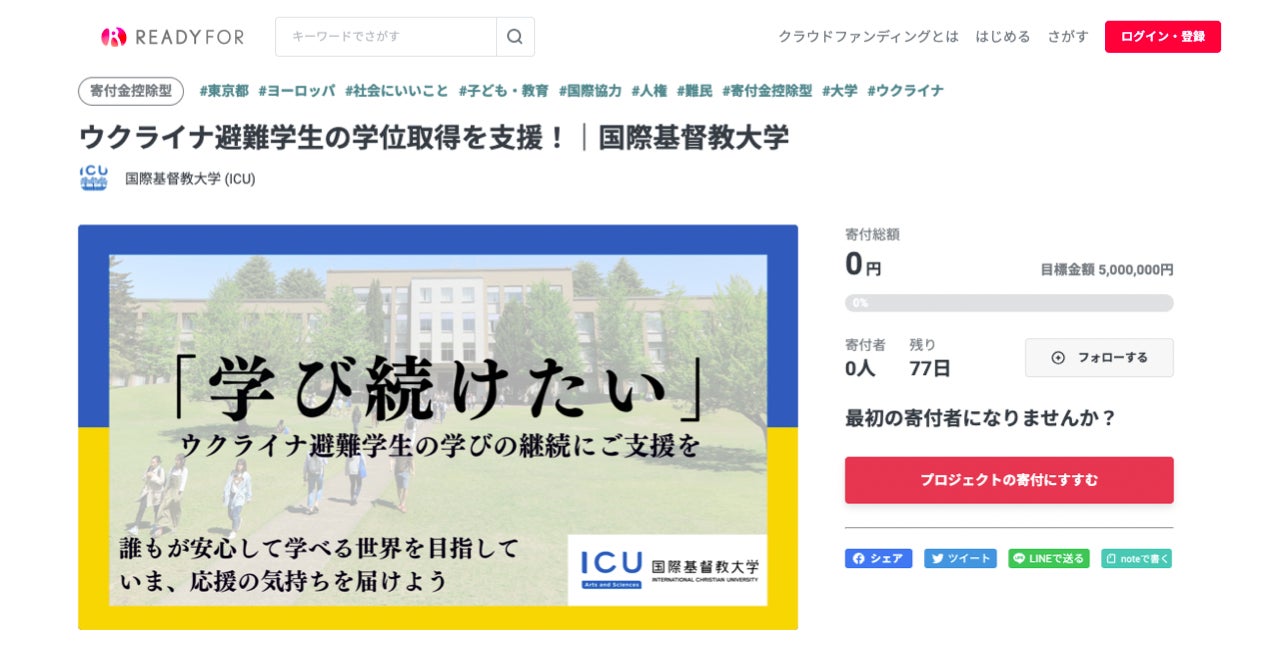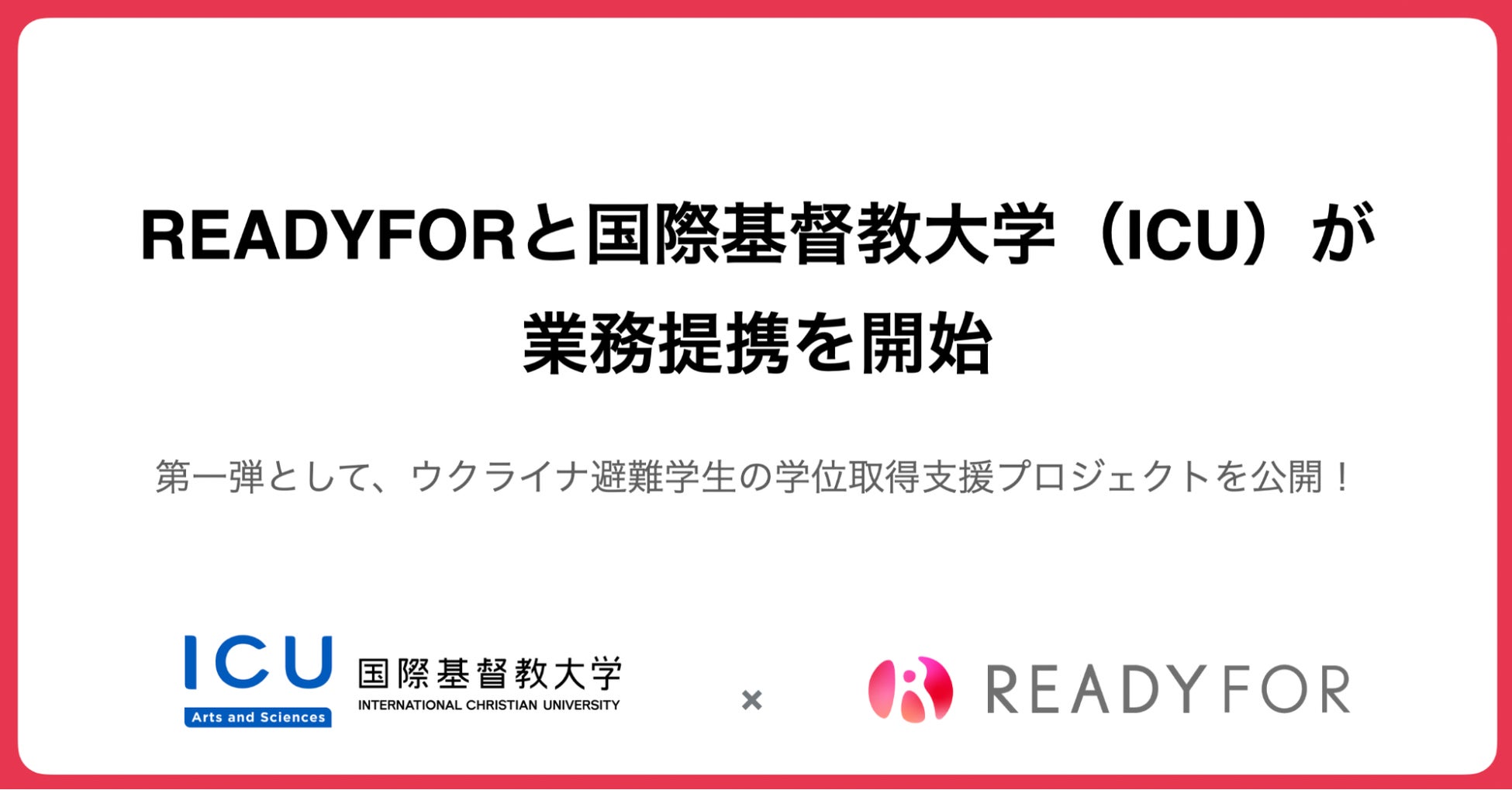 日本初・国内最大級のクラウドファンディングサービス「READYFOR」を運営するREADYFOR株式会社(本社:東京都千代田区、 代表:米良はるか)と学校法人国際基督教大学(所在地:東京都三鷹市、学長:岩切正一郎)は業務提携を締結し、本日、提携第一号としてクラウドファンディングプロジェクト「ウクライナ避難学生の学位取得を支援!|国際基督教大学」を公開いたしました。