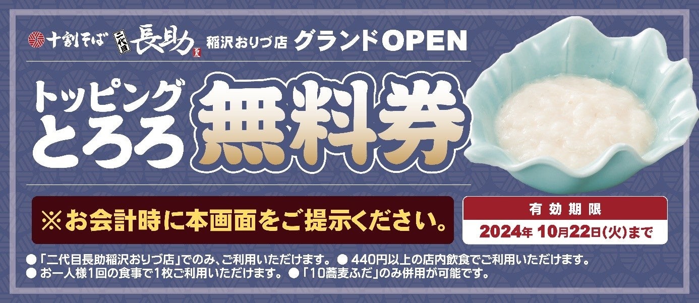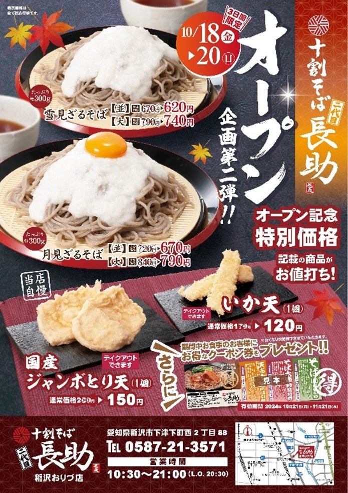 「十割そば 二代目長助 稲沢おりづ店」2024年10月18日(金)グランドオープン企画第2弾!