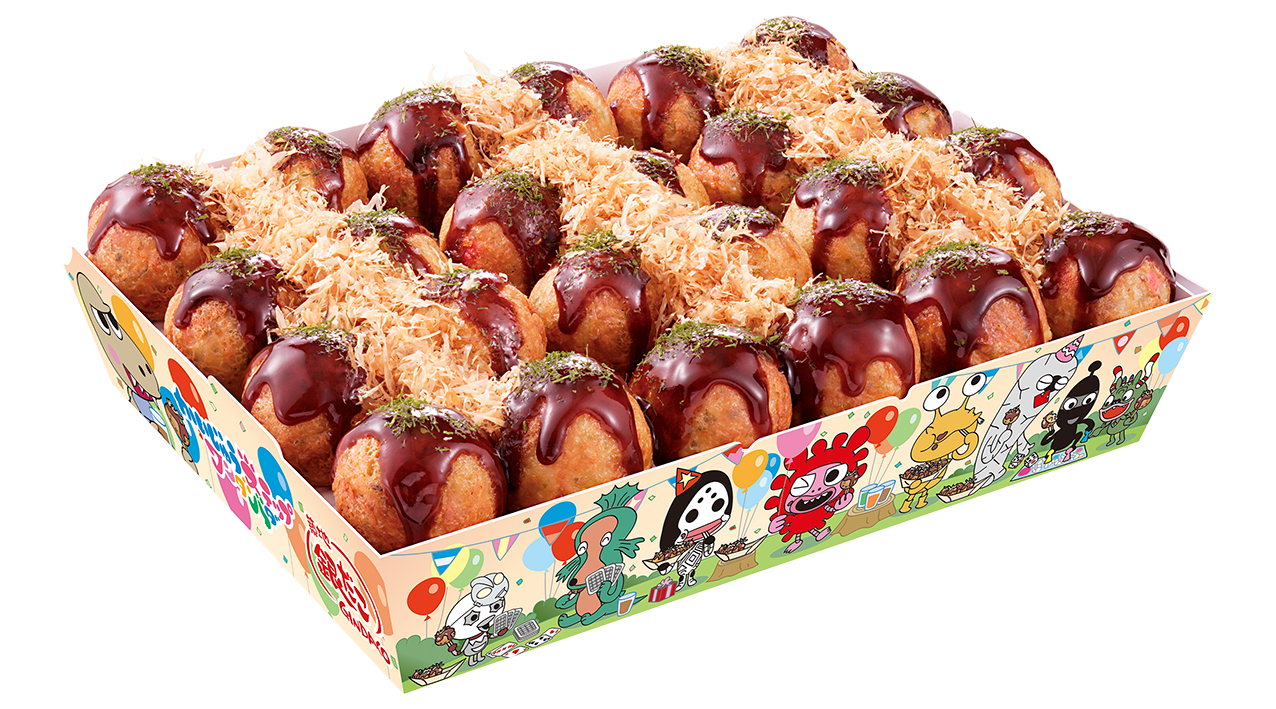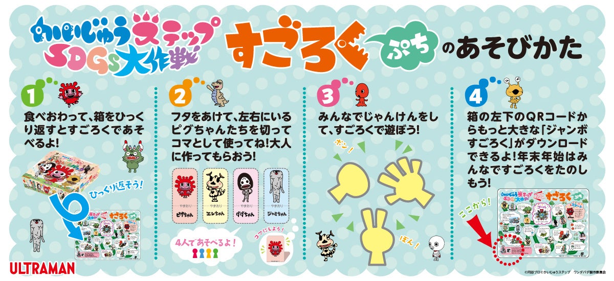 今回の商品は、キャラクターデザイナーのきはらようすけ先生による当コラボ限定の “描き下ろしイラスト” がデザインされたお持ち帰り専用の特別パックです。外装箱のデザインは、「かいじゅうステップ」のキャラクターたちが個性豊かにたこ焼やたい焼を味わい、まるでホームパーティをしているかの様なシーンをお楽しみいただけるだけでなく、だんらんパックの底面には “SDGs” をテーマにした 「オリジナルすごろく」 がデザインされており、たこ焼を食べ終わった後は、箱の左右内側にレイアウトされた駒を切取り、最大4人で遊べる特別仕様となっております。