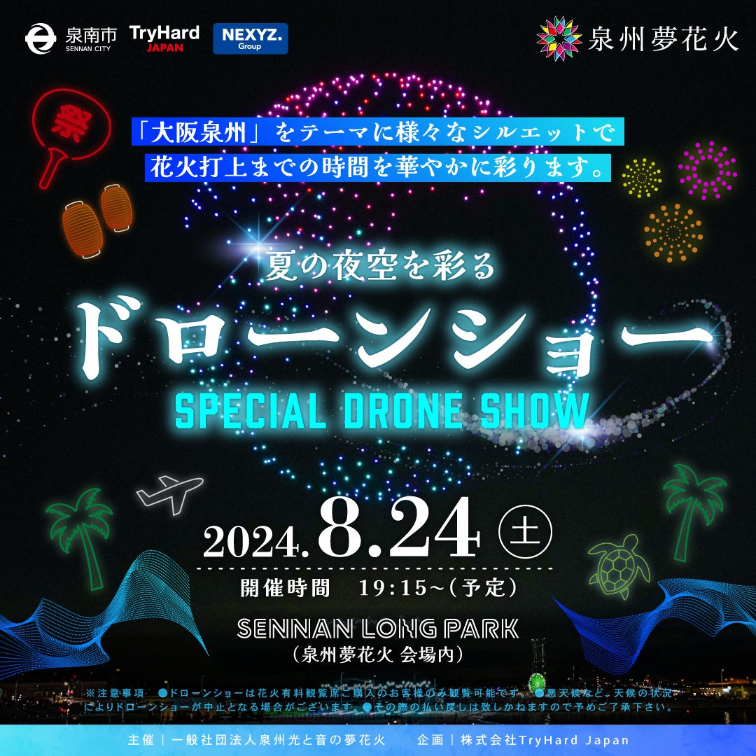 一般社団法人泉州光と音の夢花火(所在地:大阪市中央区)は、2024年8月24日(土)にSENNAN LONG PARK(センナンロングパーク)にて開催される「泉州夢花火in泉南」にて、昨年もご好評を頂いた「ドローンショー」を実施いたします。