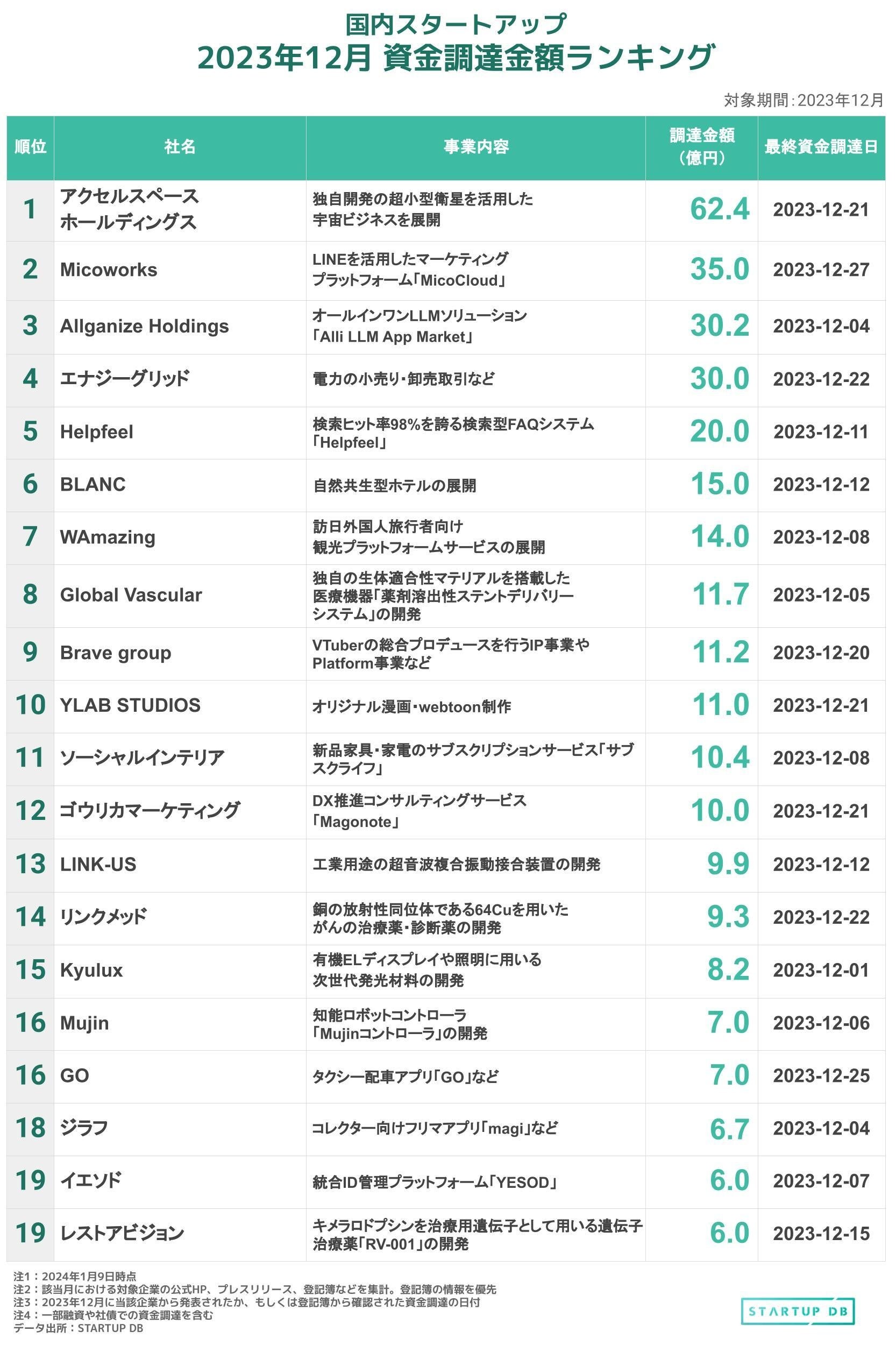 【STARTUP DB】調査結果 国内スタートアップ資金調達金額ランキング(2023年12月)