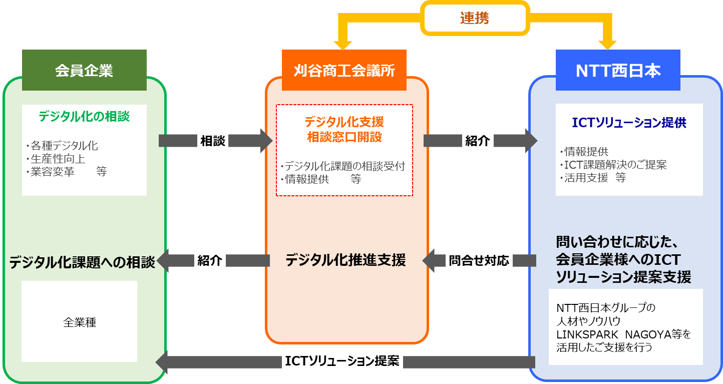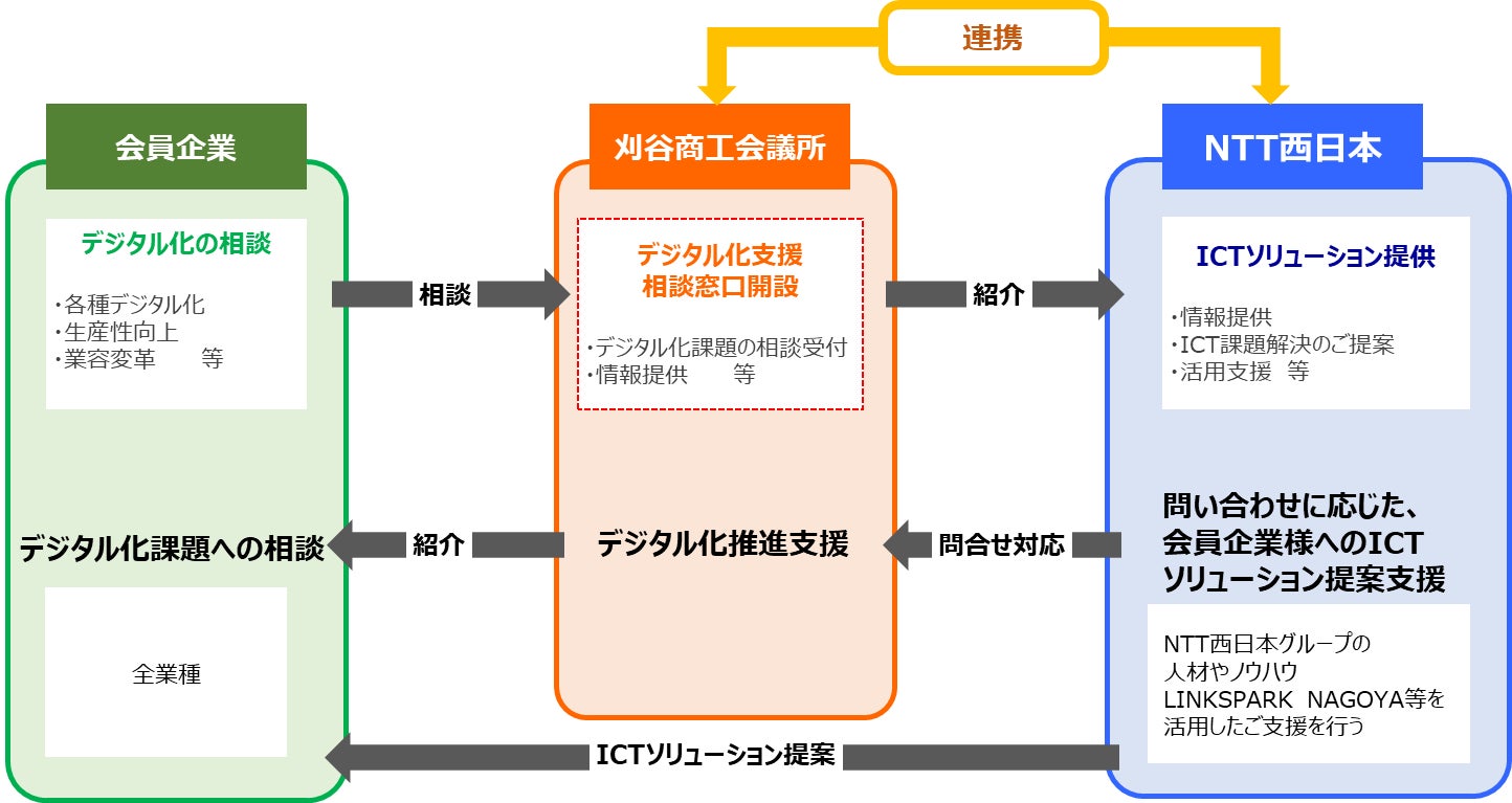 こうした状況を受け、中小企業の経営課題と地域の抱える課題解決を行う刈谷商工会議所と、「ソーシャルICTパイオニア」としてICTソリューションの提供やデジタル化推進等で、自治体や企業等の課題解決に貢献するNTT西日本が互いの強みを相乗させ、地元企業の経営課題解決やセキュリティ対策強化、デジタル化推進に貢献し、地域社会や経済の活性化を実現するため、本連携協定を締結することといたしました。