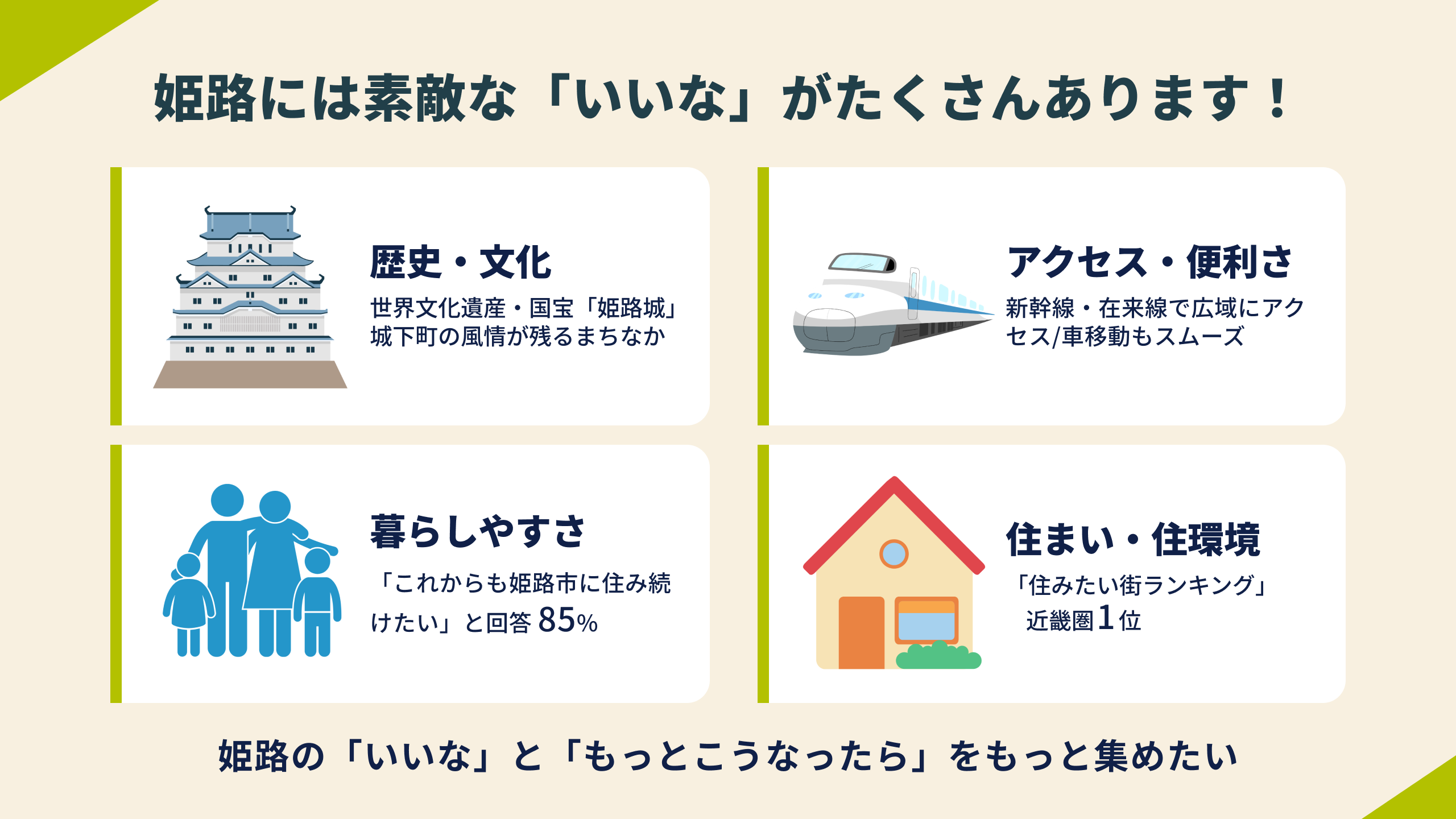 姫路市では総合計画「ふるさと・ひめじプラン2030」のもと、子育て・教育環境の充実や、ICT・AIなどの先端技術を活用した「住み続けたいまち」づくりを推進しています。こうした取り組みをさらに進め、姫路市がこれからも皆さまにとって「住み続けたい」場所であり続けるためには、実際に姫路で過ごしている皆さまの生の声が不可欠です。