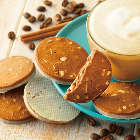香り高いコーヒー、アーモンドにヘーゼルナッツ、シナモンを入れて焼き上げたクッキーの片面にホワイトチョコレートをコーティング。コーヒーの香りとほろ苦さがホワイトチョコレートとまろやかにとけ合います。