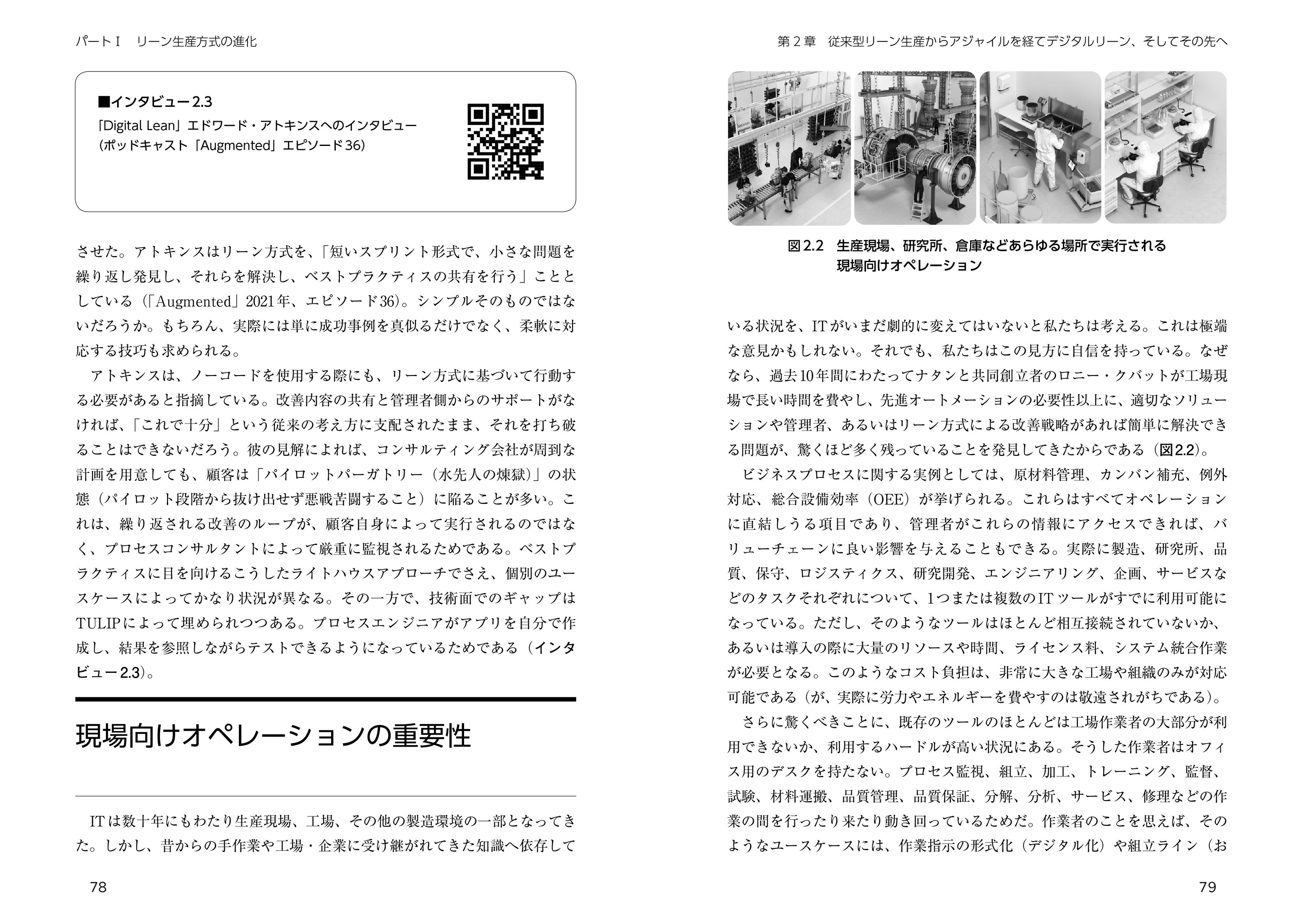 本書は、DX時代のムダを排したリーン方式を実践する上において、新しいテクノロジーが補完する極めて重要な役割を明確に示しています。仕事の能力や作業領域を拡張する「オーグメンテッド・リーン」とはどのような概念か。そして、その拡張により人間の創意工夫と自動化が作用し合って効果を高めるプロセスについてわかりやすく詳述します。