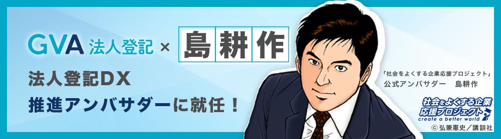 リーガルテックサービスの開発・運営を行うGVA TECH株式会社(本社:東京都渋谷区、代表取締役:山本 俊)は、株式会社シンフィールド(代表取締役 谷口 晋也)が発足し、「島耕作」が公式アンバサダーを務める「社会をよくする企業応援プロジェクト」に参画し、法人登記DX推進アンバサダーとして「島耕作」が就任したことをお知らせします。