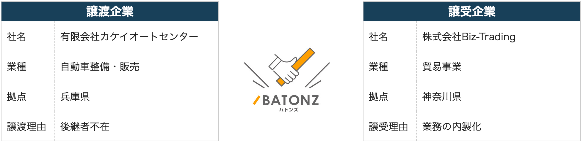カケイオートセンター様には既にいくつかの買い手候補者がいましたが、なかなか交渉が前に進まないという中で、バトンズにご相談をいただきました。広大な土地も含めた譲渡という条件面や、整備工場の立地面などを考えてなかなか対象となる企業が少ないことを予想していましたが、Biz-Trading様というベストな条件意向を持った買い手様と出会えたことで、マッチング後はスピーディに話を進めることができたと思います。