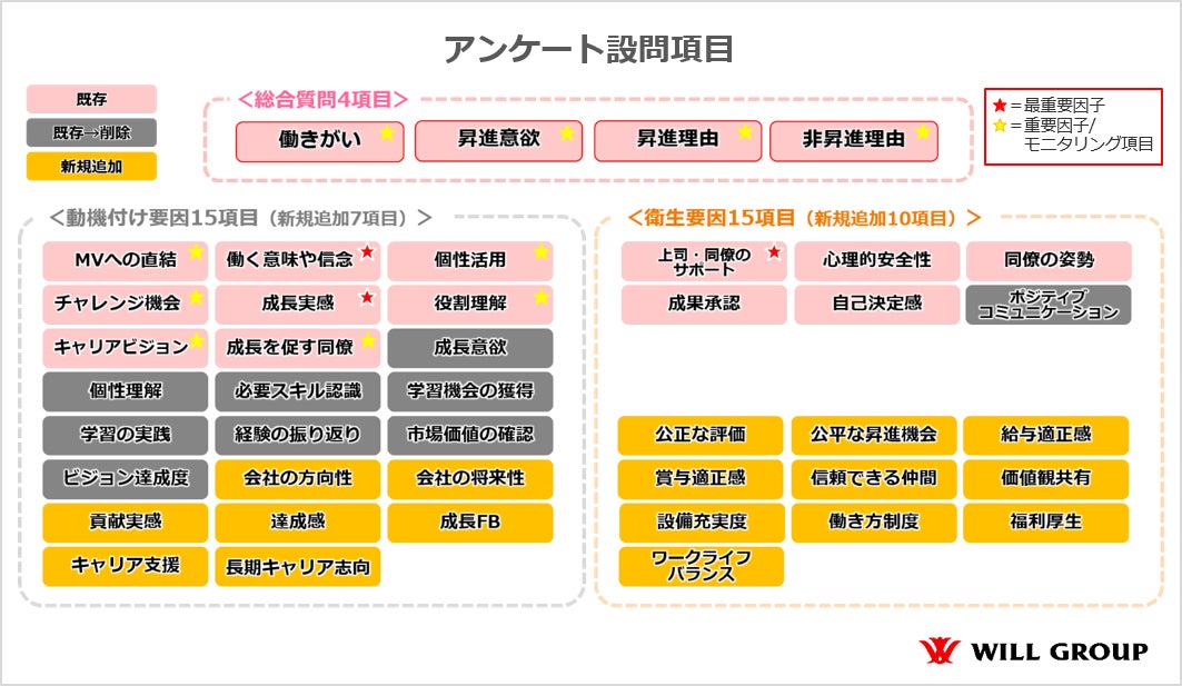 昨年までの働きがいアンケートは、キャリアや動機付け要因に関する設問に偏重していたため賃金等の衛生要因に関する設問は設けておりませんでしたが、トップマネジメント層から「賃金や評価も働きがいに影響しているのでは」という声もあがったことを受け、今回より、最重要因子に関わる重要な設問はそのままに、給与や評価等に関する衛生要因に関する設問を追加しました。