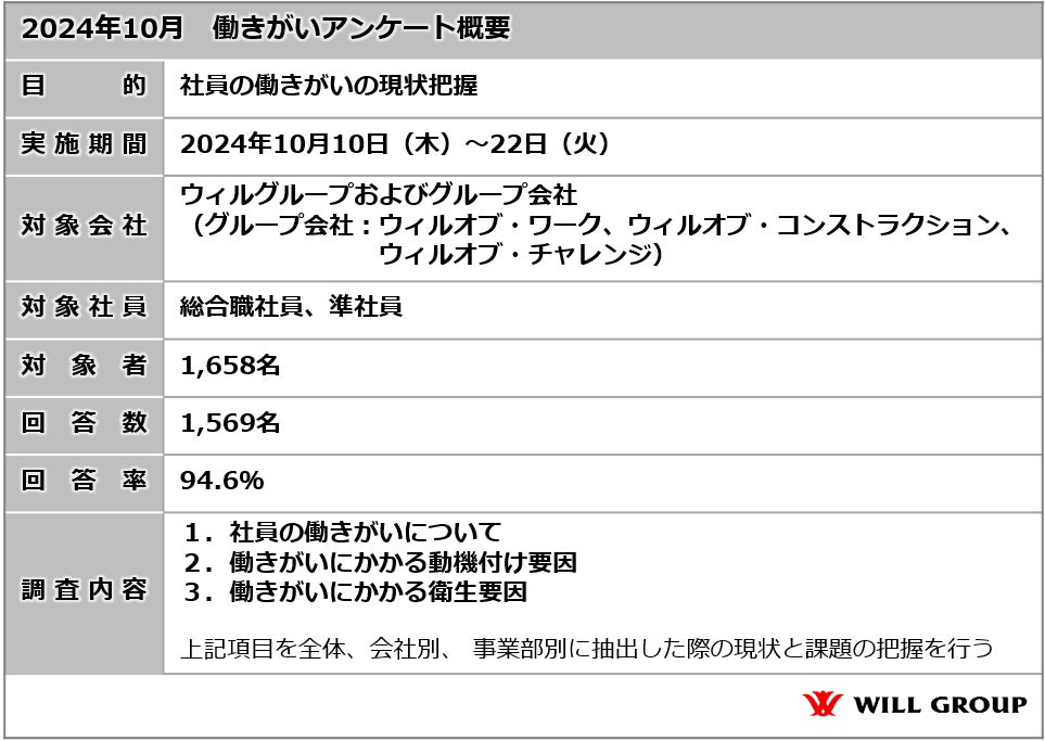 株式会社ウィルグループ(本社:東京都中野区、代表取締役社長 角 裕一)は、『個と組織をポジティブに変革するチェンジエージェント・グループ』をミッションとして掲げ、2019年から社員のWell-beingを高めることを重視し活動しています。今回のWell-beingレポートVol.5では、当社グループが人的資本経営の一環として、2021年から社員の「働きがい」の現状把握を目的に実施している「働きがいアンケート」 の2024年10月度実施結果をご報告いたします。