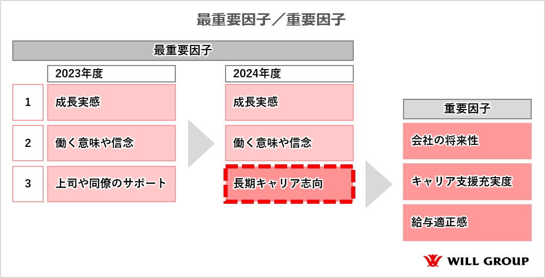 今回の結果では、3つの最重要因子の1つである「上司や同僚のサポート」に代わり「長期キャリア志向」が重要な因子として新たに浮上しました。「長期キャリア志向」には、「会社の将来性」や「キャリア支援充実度」のほか、衛生要因である「給与適正感」が因子として含まれます。