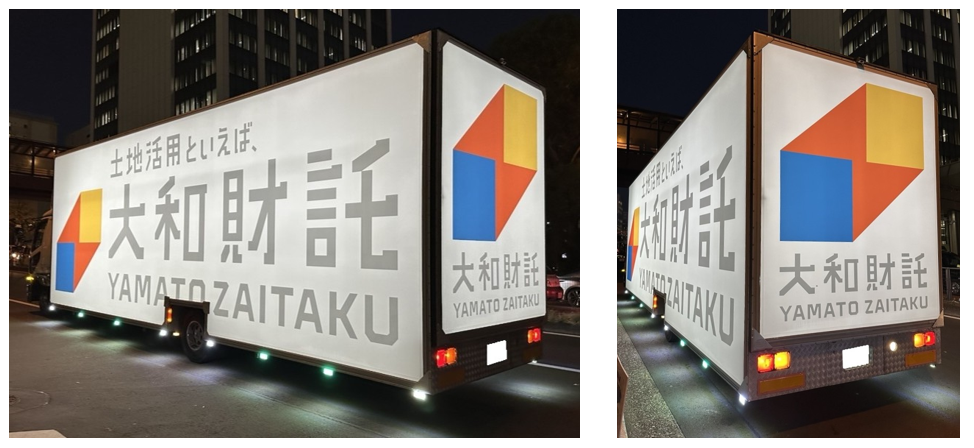 今回のアドトラックは、大和財託のロゴと社名を車体全面に大きく配置し、遠くからでも視認できるインパクトあるデザインを採用しました。ブランドカラーを基調に、当社が掲げる「資産価値共創」という理念を表現するビジュアルを組み込み、街中で一目で「大和財託」と分かる存在感を演出しています。さらに、当社ロゴには漢字表記に加え、読み方がわかるように「YAMATO ZAITAKU」のアルファベット表記を組み合わせ、大和財託の認知をより確実にする工夫を施しました。デザインには当社の世界観を感じられる要素を取り入れ、信頼感と先進性を兼ね備えたイメージを発信します。