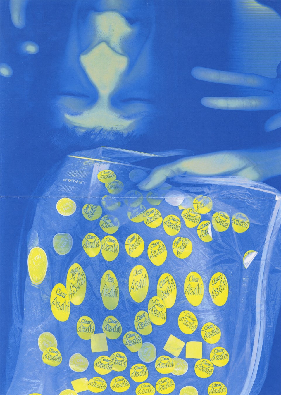 街のコンビニと施設のコピー機を使って、自分の顔とその時々の気に入ったものを写し取ることを毎日の日課としている。ガラス面に顔を押し付け自分でボタン操作し、センサー光の動きと共に身体を動かすことで、画面に独特の歪みを作り出す。作品中に多用されるシールは、施設でのアルミ缶作業中に剥がした景品応募シールで、これまで何度も当選している。近所のコンビニには20年あまり毎日通っており、終わると店員が手際よくガラス面についた顔の脂を拭いてくれる。