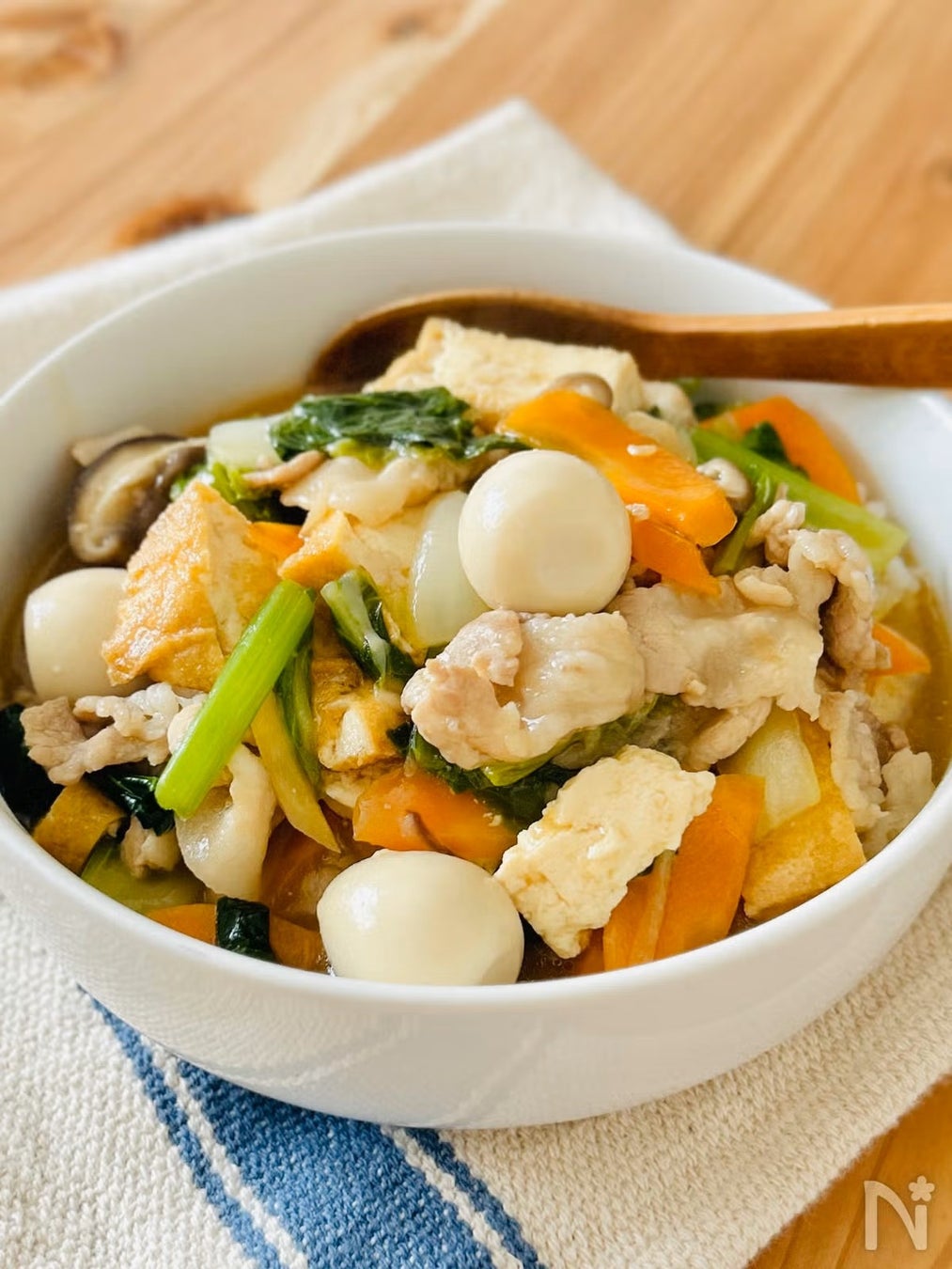 帰宅が遅くなった日や試験期間中など、ササッと食事を済ませたいときに大助かりの時短メニューです。豚肉、白菜、小松菜、にんじん、しいたけ、厚揚げ、うずらの卵と、ひと皿でこれだけの食材が一度に摂れるのがうれしいポイント。素材のうま味が溶け出した、アツアツのあんに絡めてペロリと食べられます。