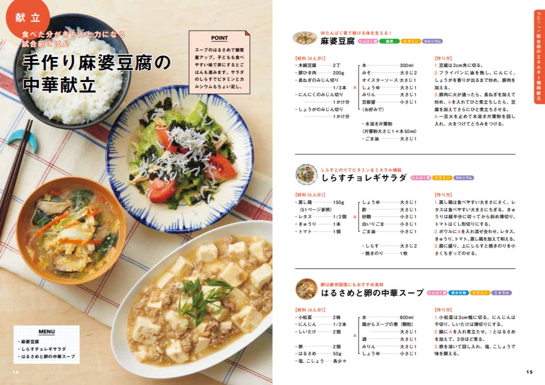 これまで発信してきたレシピの中から、特に反響が大きく、がんばる子どもたちのパワーチャージにぴったりな料理を厳選したパートです。肉と豆腐、2つのたんぱく質を同時に摂れる「手作り麻婆豆腐」など、体作りの基礎を支える主役級の絶品おかずが並びます。
