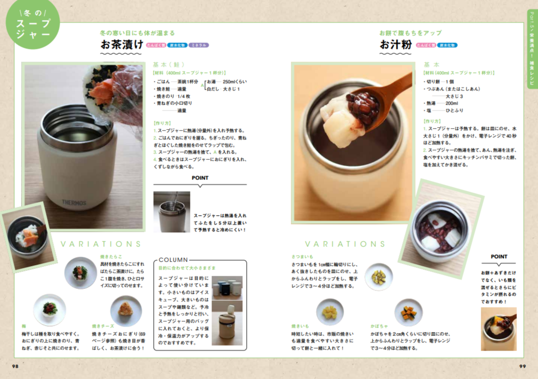 「練習前後や小腹がすいたときに、何を食べさせたらいいの?」という悩みに寄り添うパートです。移動中や塾帰りでもパッと口にできる軽食や、スープジャーを活用して「夏はひんやり、冬はポカポカ」と最適な温度で栄養を補給できるアイデアが満載。あわただしい移動時間や待ち時間さえも、明日のコンディションを整える大切な「エネルギー補給タイム」に変えてくれる、アスリート家庭の知恵が詰まったレシピがそろっています。