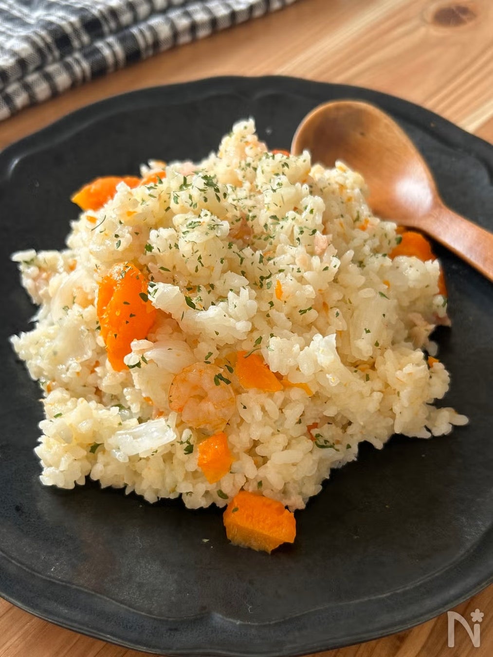 玉ねぎを丸ごと入れ、にんじんも皮つきのまま炊き込む、見た目にもインパクトのあるピラフです。食材を細かく切る手間が省けるので、忙しい朝にもぴったり。炊きあがったあとに玉ねぎとにんじんをしゃもじで切りながら混ぜ合わせれば、野菜の甘みが広がります。えびやベーコンも入り、たんぱく質と糖質、ビタミンをしっかり補給できる優秀な主食です。