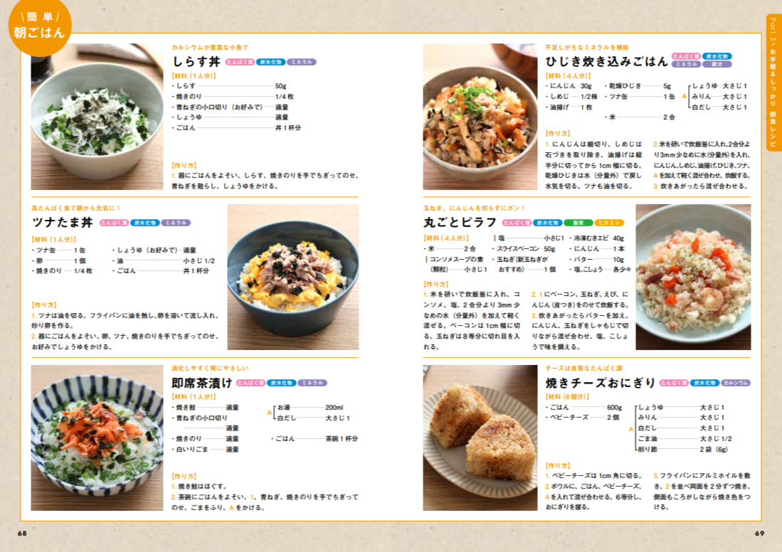 エネルギー不足になりがちな朝に心強いのがこのパートです。包丁を使わず5分で作れる「しらす丼」や、手作りのふりかけなど、手軽に作れるのに栄養満点なレシピをたっぷり収録。台所に立つ時間を短縮しながらも、一日の健やかなスタートをサポートするメニューがそろっています。どれも家族が「また作って!」と大絶賛する、美味しさもお墨付きのメニューばかりです。