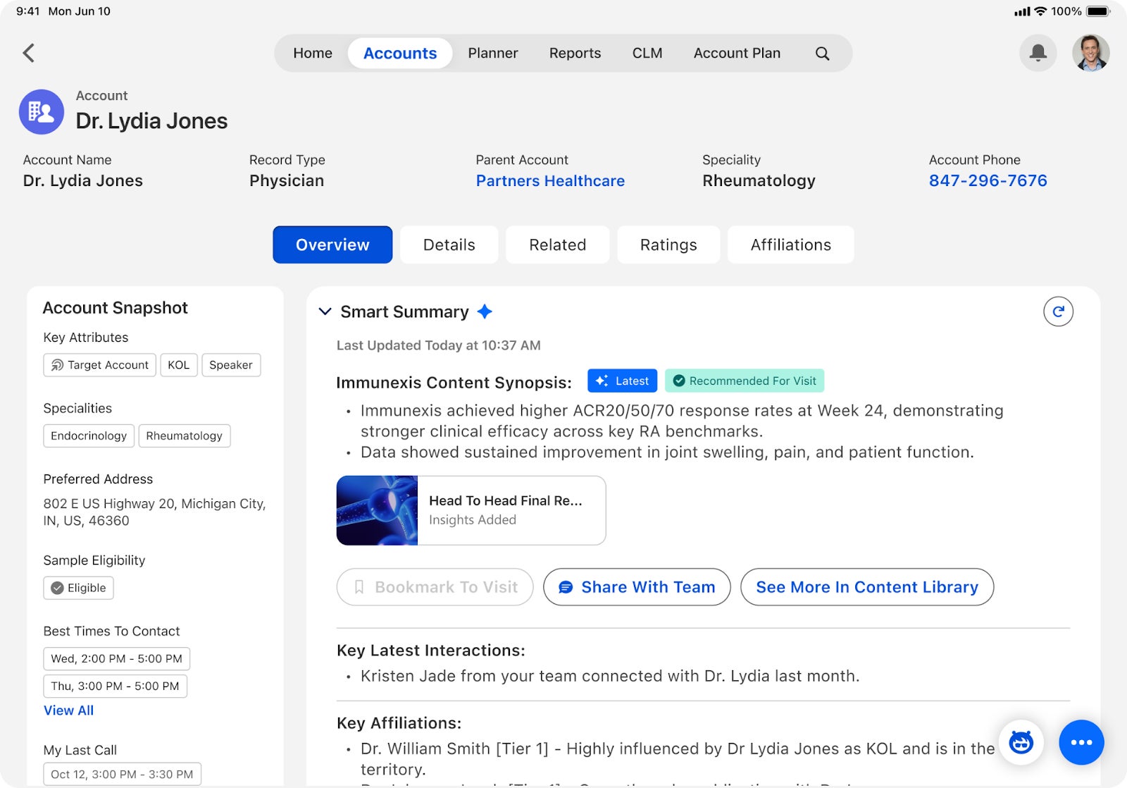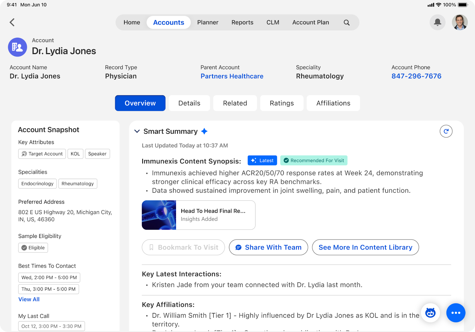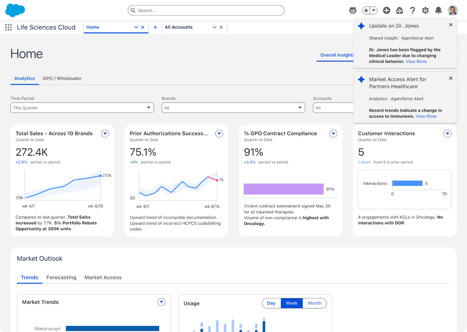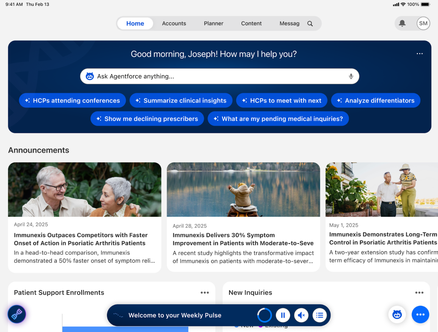Salesforceの単一のアーキテクチャ上に統合されたプラットフォームにネイティブ構築されたLife Sciences Cloud for Customer Engagementは、従来のCRMの枠を超え、業務フローの中で直接、消費者向けの対話型ユーザー体験と企業レベルのセキュリティおよびコンプライアンスを提供します。これにより、営業担当者は多忙な医療従事者との限られた面談時間を最大限に活用できるようになります。音声入力によるメモやコンプライアンスチェック、ポッドキャストのようなストーリー機能、簡潔なアカウントサマリーにより、外出中のMR、MSL、SRは、24時間365日いつでも重要な情報にアクセスでき、医療従事者が患者さんを最善の方法で治療できるよう支援します。