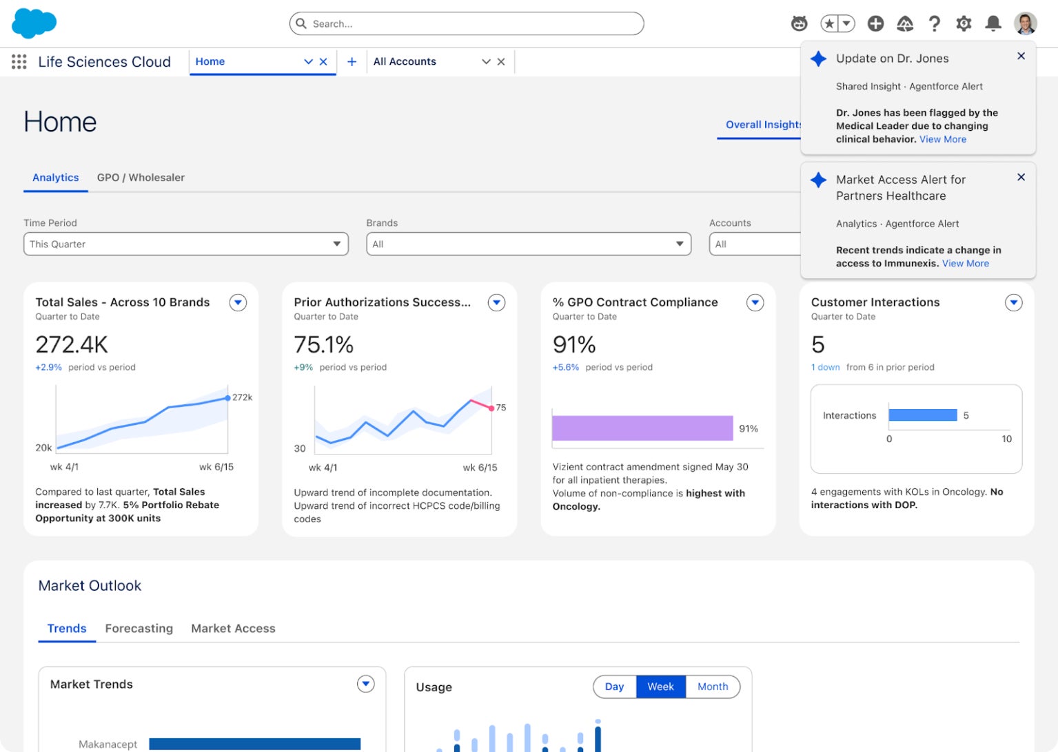 信頼性の高いSalesforceプラットフォームに構築されたLife Sciences Cloudにより、複雑な臨床からコマーシャルまでのプロセスでチームを統合し、患者さんのアウトカム(施策により得られる効果)を改善させる、AIエージェントファーストのアプリを提供