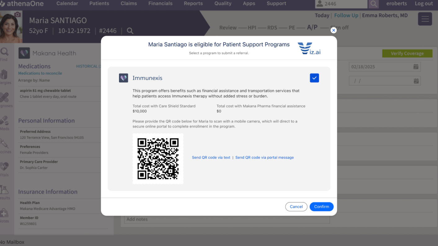 athenahealthやViz.aiなどとの連携により、医療従事者は診療現場において、患者さんにレコメンドされる経済的支援プログラムを知らせることが可能となります。これにより、医師は患者さんを電子健康記録(EHR)システムから患者支援プログラムへの登録手続きを進められます。