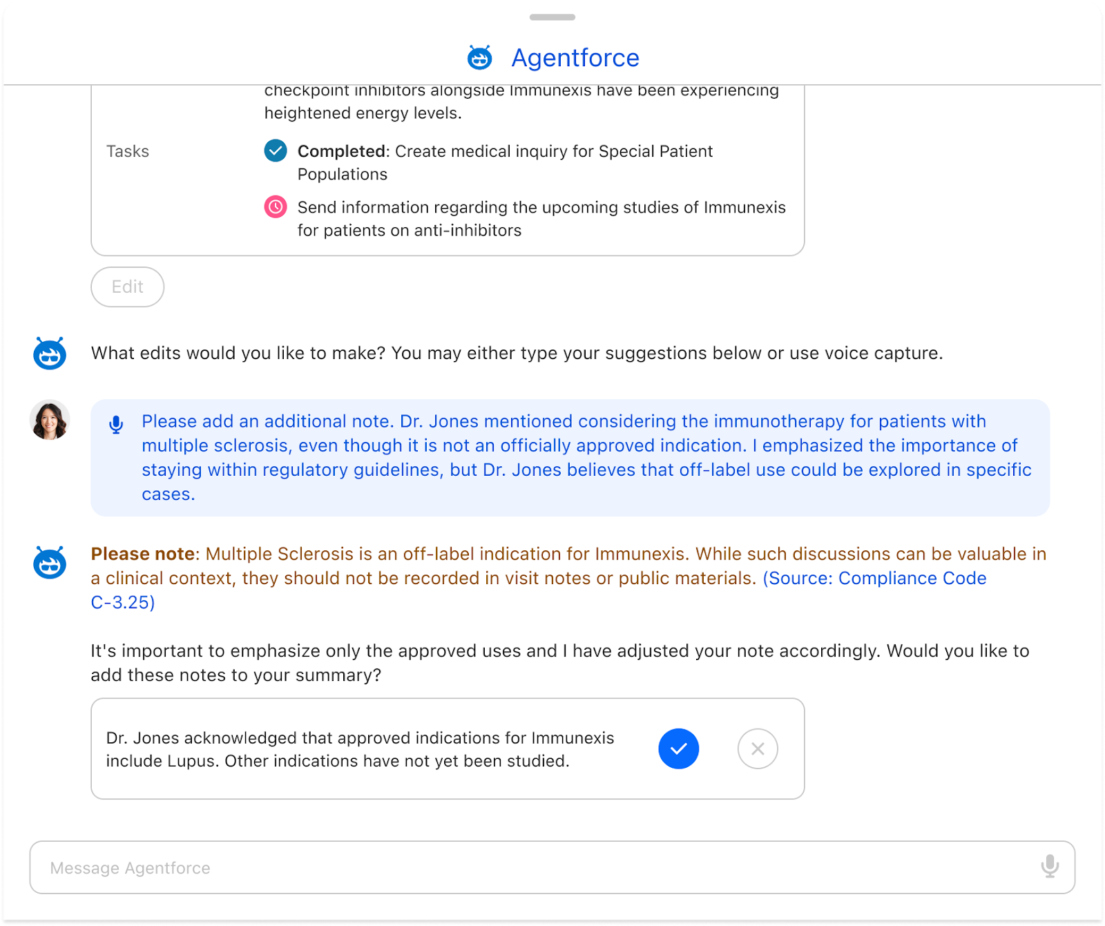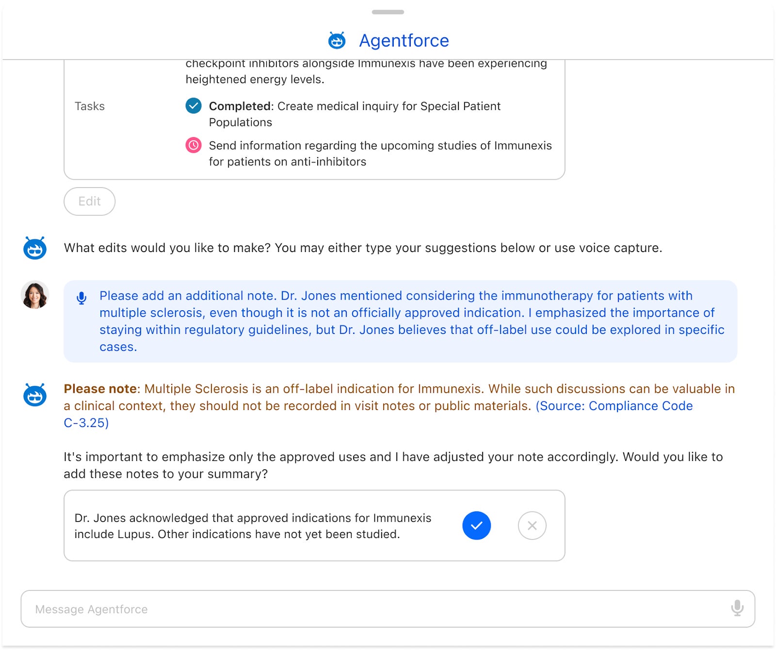 Agentforceは監査履歴を記録し追跡可能性を確保するパーソナルアシスタントとして機能し、FDA 21 CFR Part 11準拠の電子署名による同意取得を通じて、対面、オンライン、ハイブリッド形式の訪問全般におけるガバナンスを保護します。