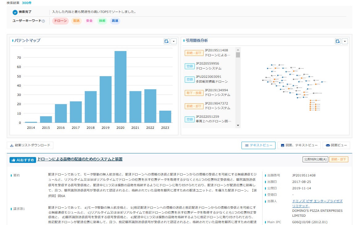 生成AIを活用した特許の分析だけでなく、従来の特許調査ツールでできるような機能も備わっています。キーワードや技術分野ごとに絞り込み検索を行ったり、引用/被引用関係を分析することもできます。