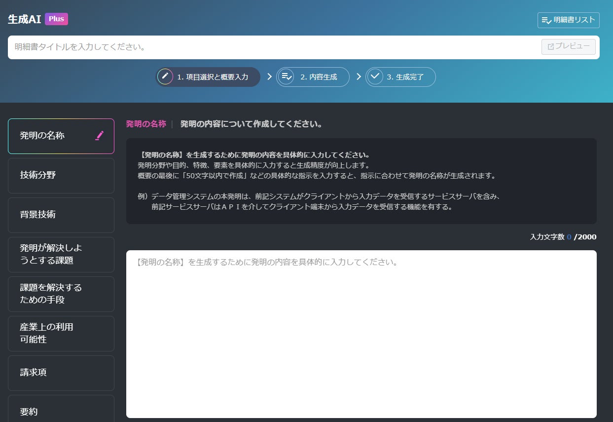 AIドラフト機能では、特許の明細書のドラフトを項目別に生成できる機能となっています。