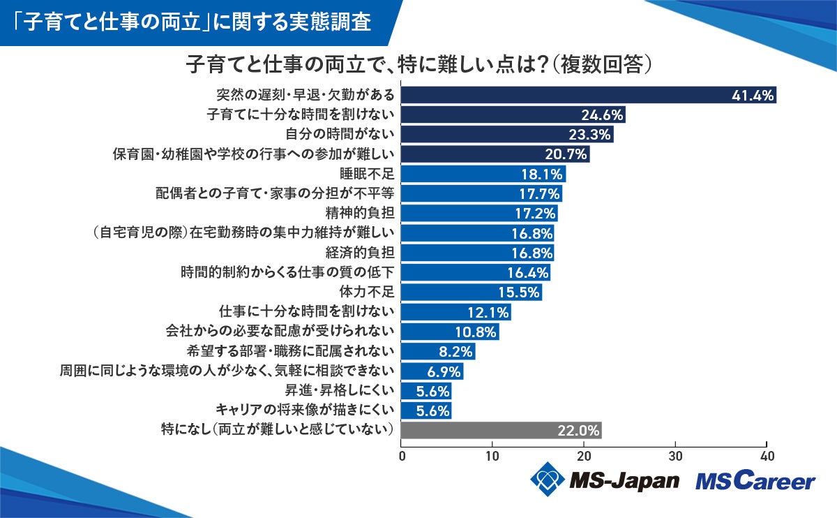 子育てと仕事の両立において特に難しい点として、「突然の遅刻・早退・欠勤がある」と回答した人が41.4%と最も高い割合を占めています。