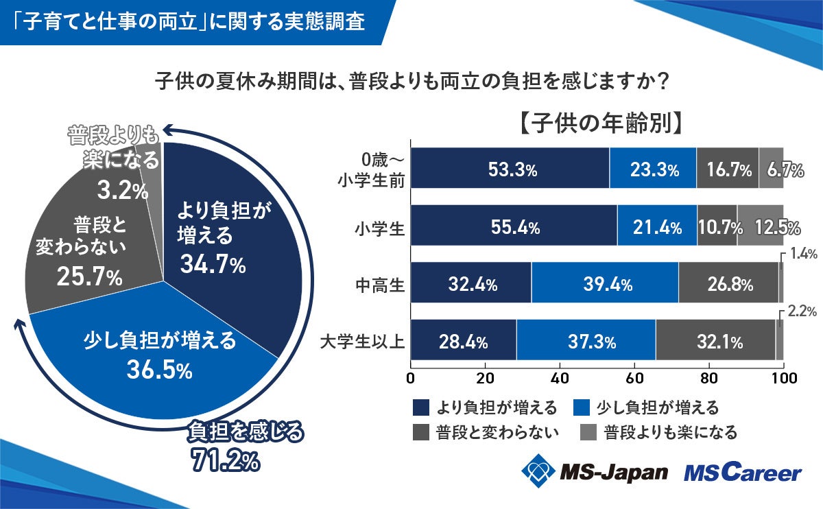 「子供の夏休み期間」における両立の負担について調査した結果、71.2%が「負担を感じる」と回答。