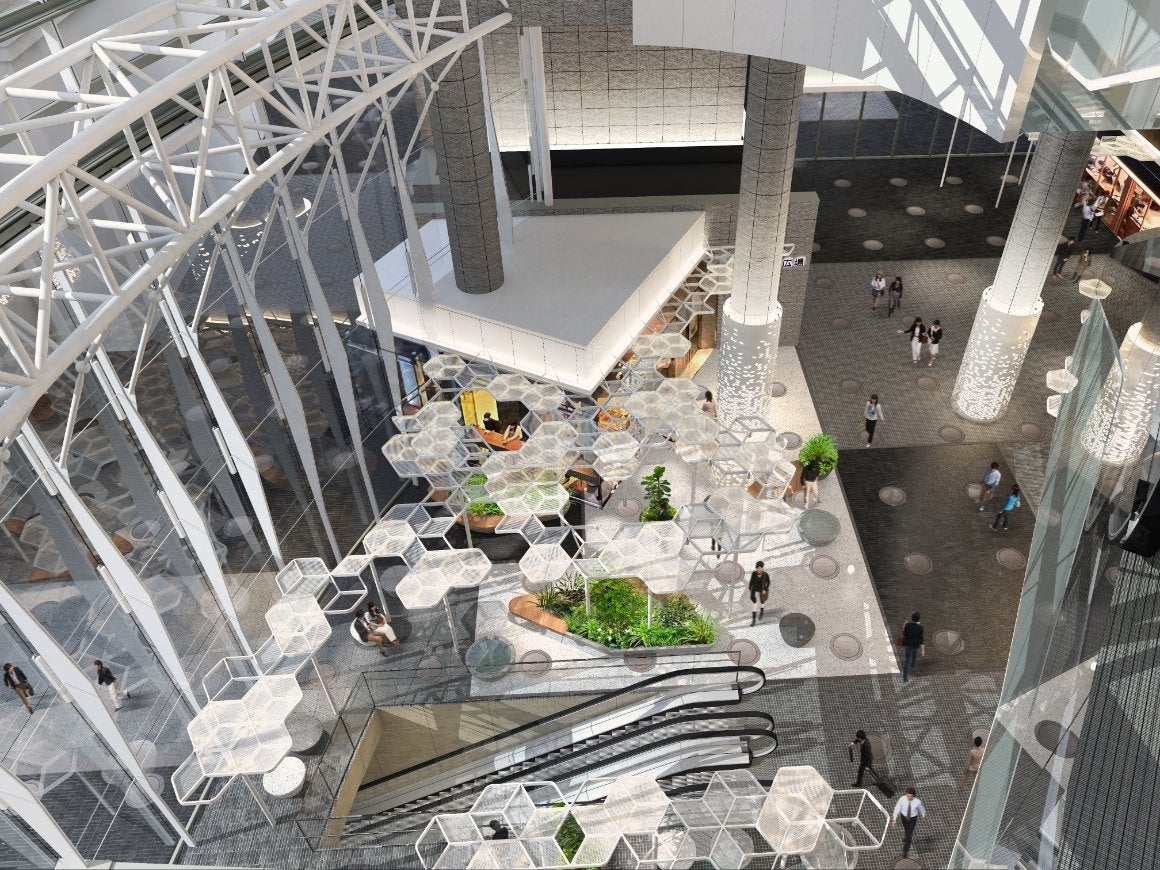 今年9月に丸の内オアゾは開業20周年を迎え、2025年春にかけて段階的なリニューアルを実施します。1階アトリウムは、オアシスの木立を連想させるキャノピーを面的に展開し「木陰」を作ることで大空間をヒューマンスケールに落とし込み、心地よい滞留空間を創出します。