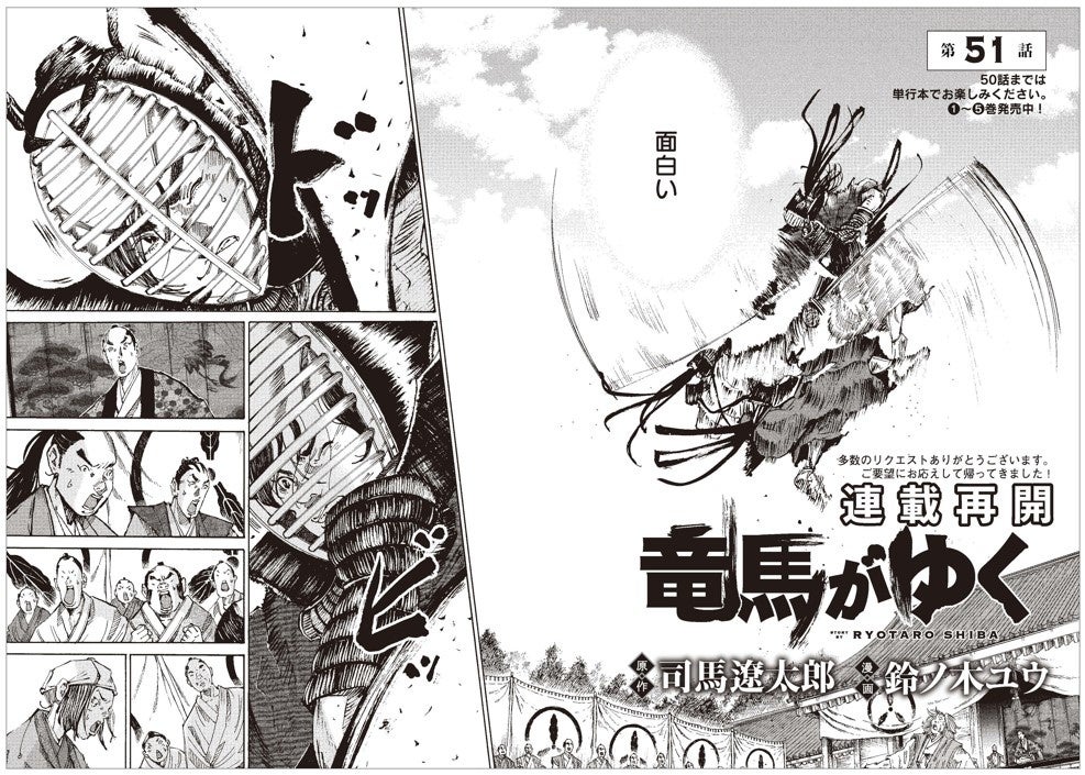 その後文春オンラインで連載を続けていましたが、読者からのリクエストに応える形で「週刊文春」で連載復活となりました。復活回となる51話は坂本竜馬と桂小五郎、幕末の英雄同士の剣術大会決勝。勝った方が江戸一番の剣士の称号を得ることになるのですが、強さは互角。決着やいかに!?