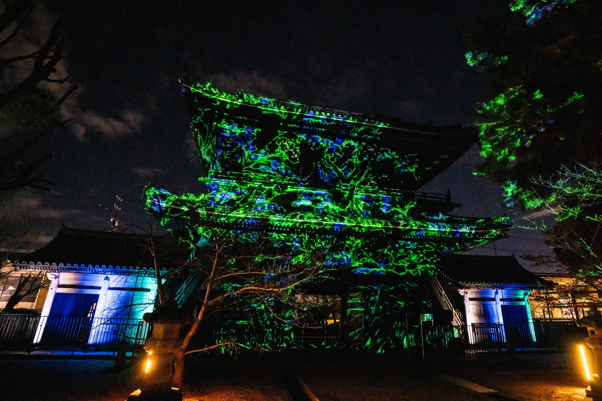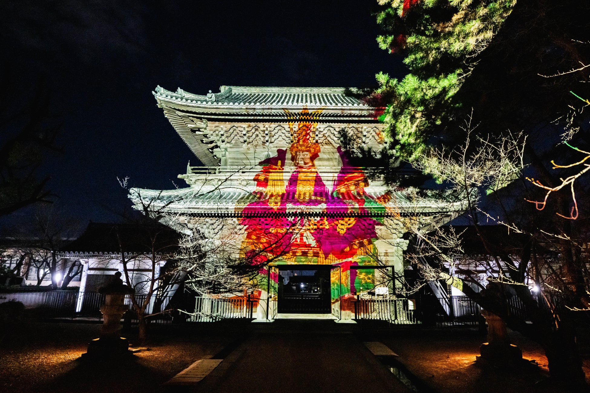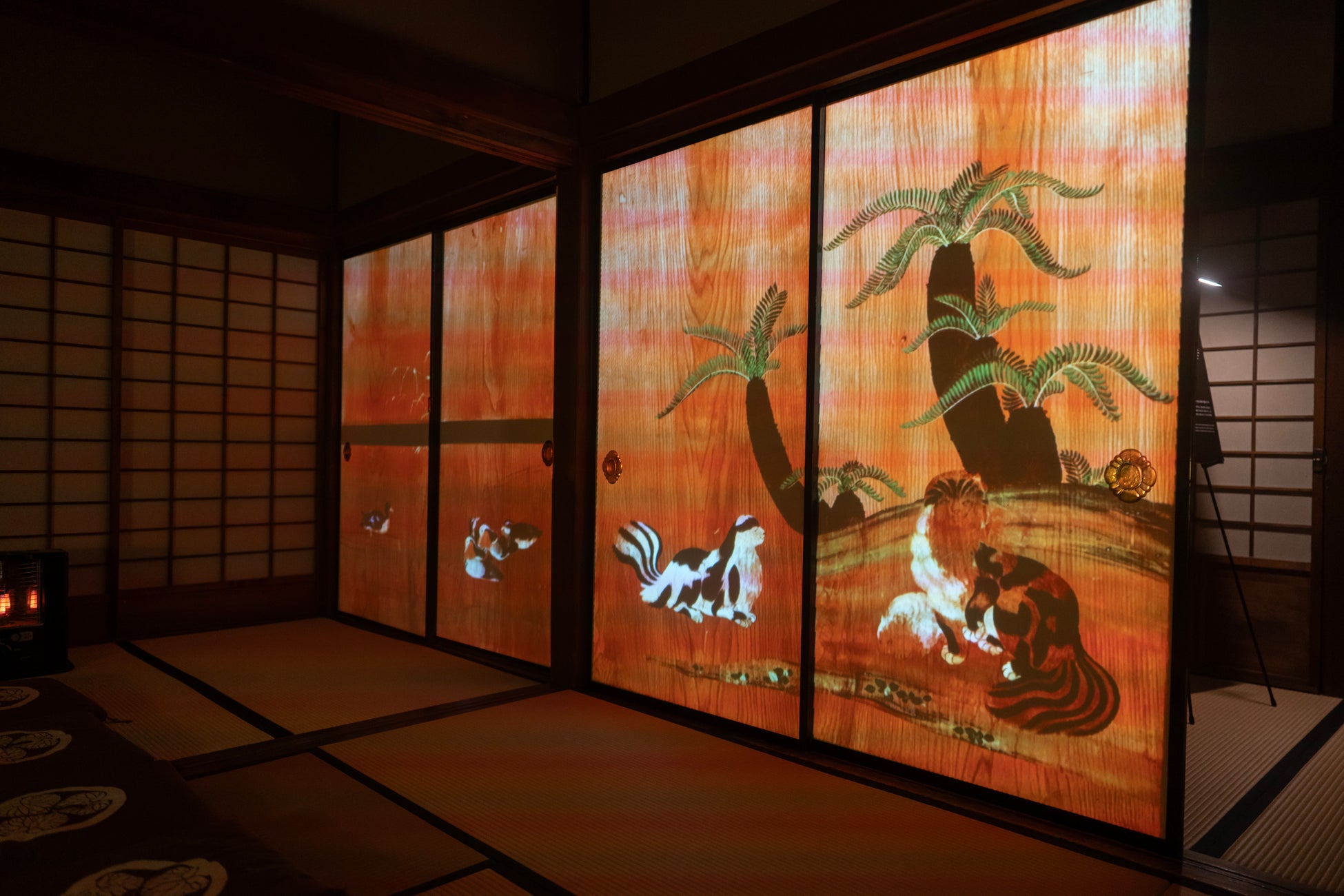 また、本堂奥の大方丈に復元された冷泉為恭筆・大方丈障壁画の襖の間や位牌堂を夜ならではの幻想的な光で彩り、大方丈障壁画49面とともに重要文化財に指定され40年以上公開されていない「板絵著色杉戸絵」16面と「小方丈杉戸絵」6面あわせて22面の高精細デジタルデータを初めて活用し、プロジェクションマッピングで杉戸絵の世界を再現する夜間特別拝観を行いました。