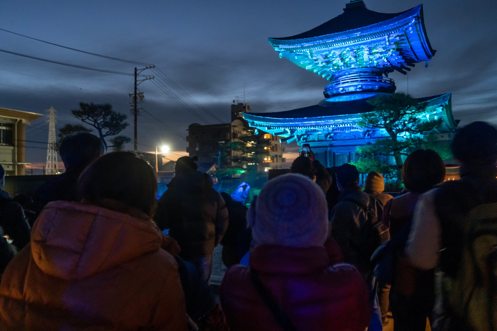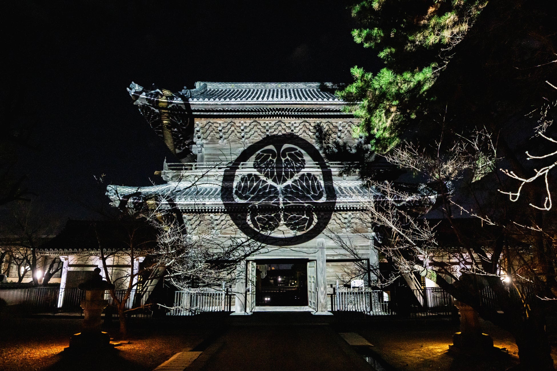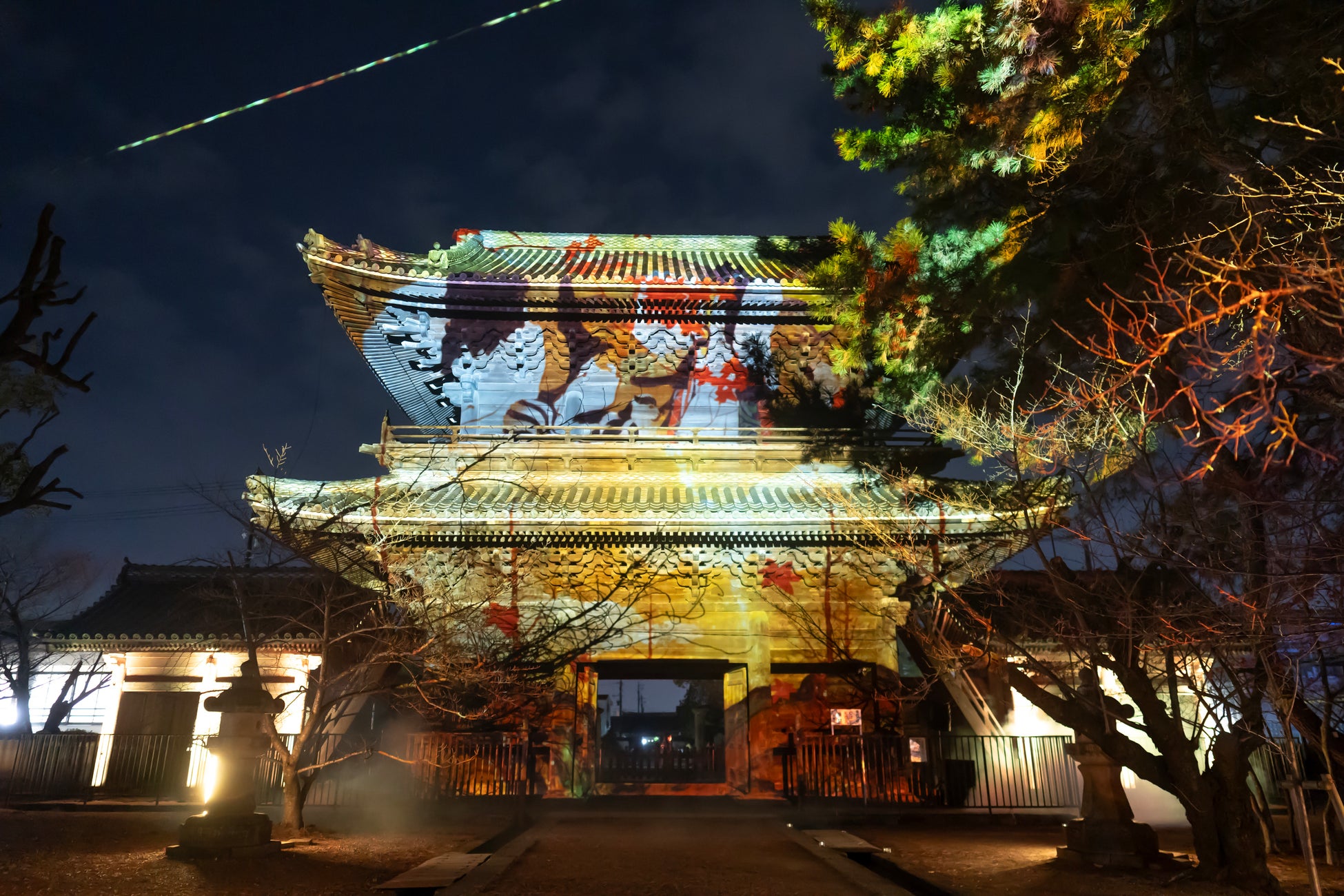 松平家・徳川将軍家の菩提寺である大樹寺で、愛知県指定有形文化財・山門の壮麗な建築に大樹寺が誇る重要文化財・大方丈障壁画をはじめとする文化財の数々をモチーフとしたプロジェクションマッピング映像を投影したほか、重要文化財・多宝塔を含む境内のライトアップを行いました。