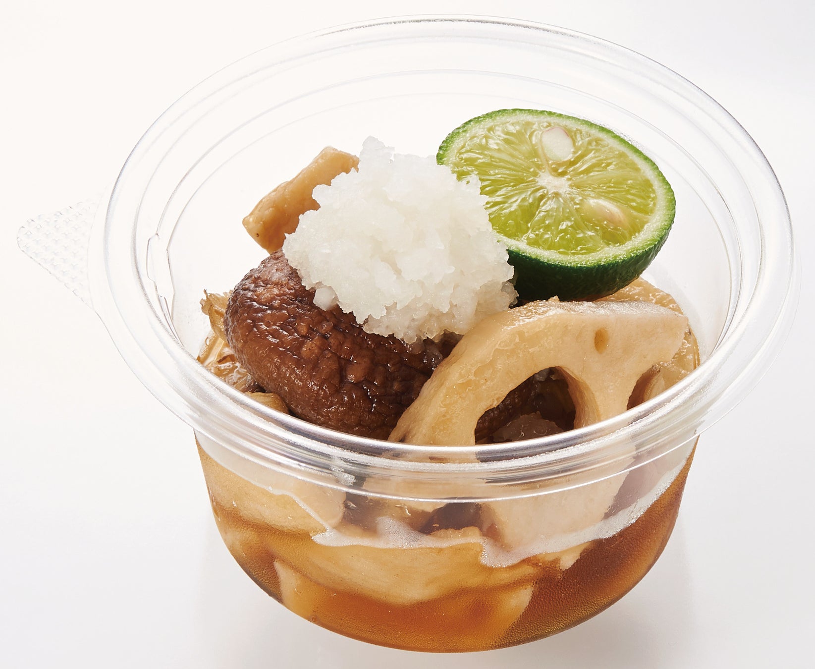店内で素揚げにした5種類の「きのこ(舞茸・椎茸・しめじ・ブラウンマッシュルーム・エリンギ)」は旨味が凝縮し、「だし汁」と合わせた時に味わい深くなります。切りたての新鮮な「すだち」と「大根おろし」で爽やかさが加わった「だし汁」は、全て飲み干したくなる美味しさです。「れんこん」のシャキっとした食感がアクセントになっています。
