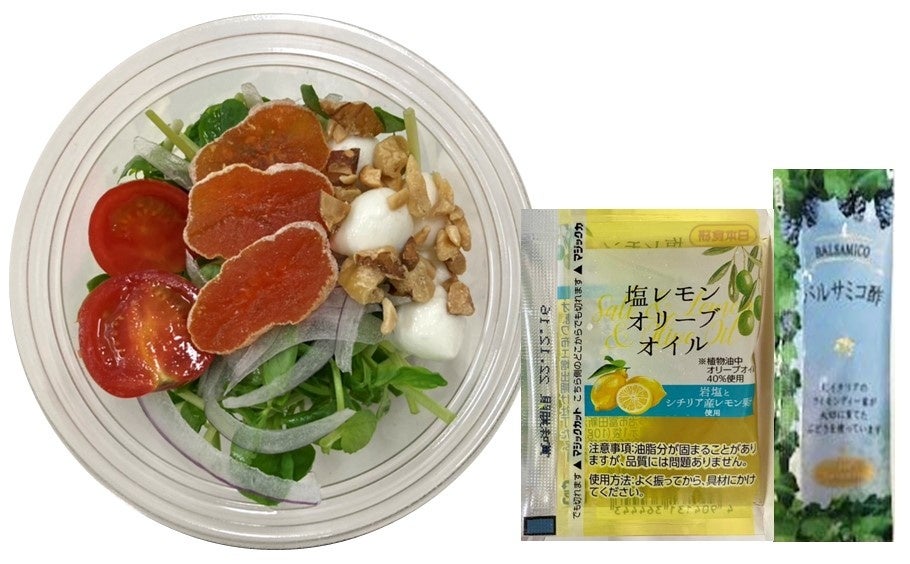 そのまま食べるのが一般的な「市田柿」を主役にすることで「意外性」と「気軽さ」をお楽しみいただけるサラダです。「市田柿」の濃厚な甘味や独特の柔らかな食感に「ドライフルーツ」「生野菜」「ナッツ」「チーズ」と様々な素材を組み合わせました。バルサミコ酢でコクを深めつつ酸味を加えて甘さのバランスを整え、塩レモンオリーブオイルの爽やかさで全体をまとめています。