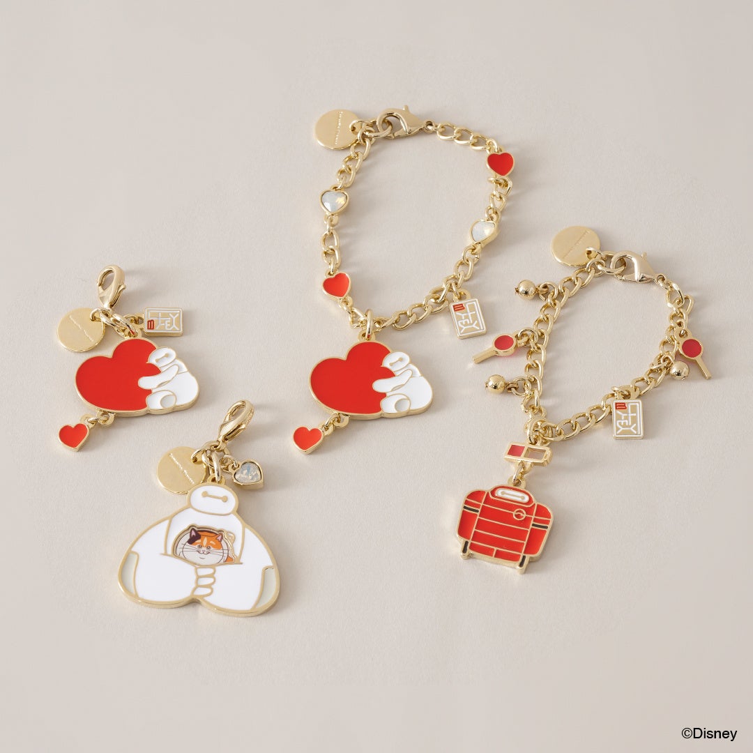 「ベイマックス」が「モチ」をギュッと抱きしめている様子やハートを抱きしめる「ベイマックス」、充電中の「ベイマックス」の姿をチャームにデザイン。ハートのビジューモチーフやバッテリーモチーフなど、チェーン部分の細かなデザインにも大注目。愛あふれるモチーフがあたたかい気持ちにしてくれる。同シリーズのバッグや小物との組み合わせも楽しんで。