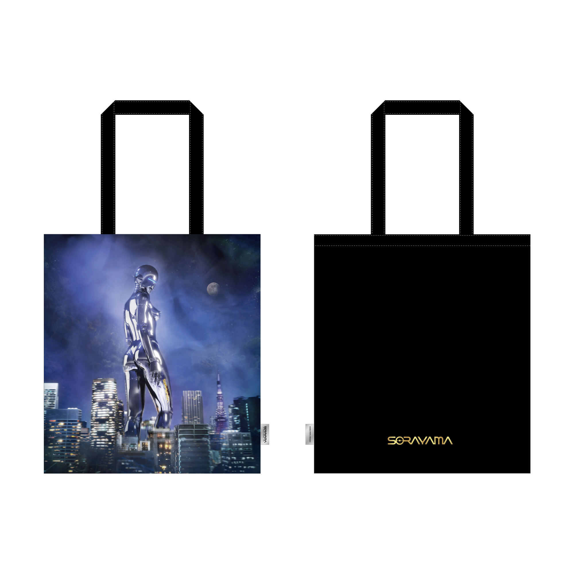 本展覧会キービジュアルをフロント全面にあしらった合皮素材のトートバッグ。裏面にはSORAYAMAロゴの刺繍も。