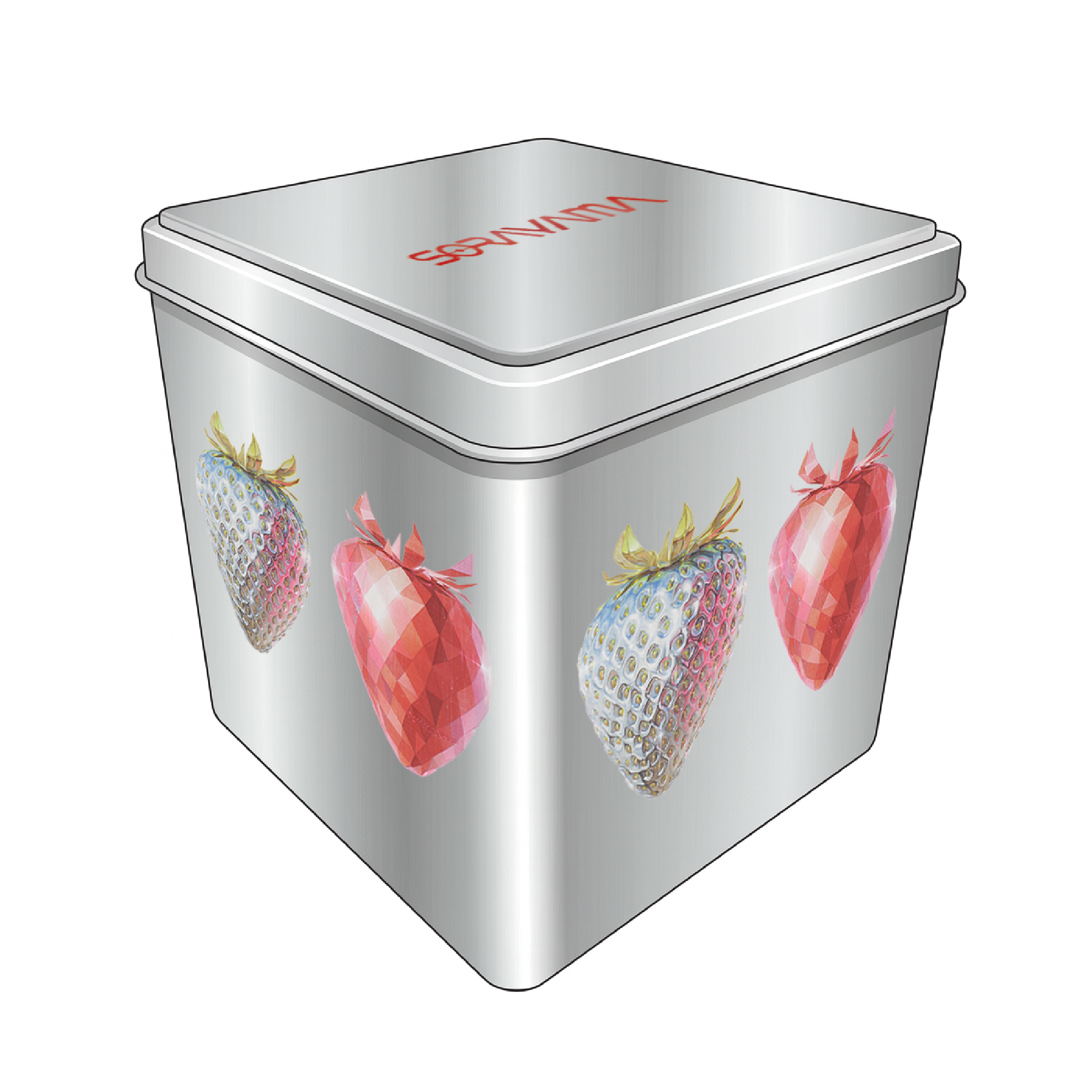 “サクッ”とした食感のフリーズドライ苺の中にホワイトチョコレートを染み込ませたしっとりと甘い口どけのチョコレート。作品絵柄がマッチしたメタリック缶付き。
