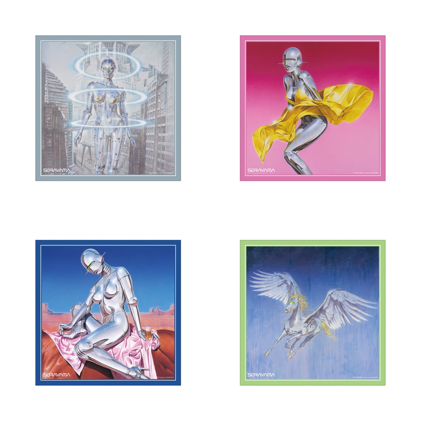 空山基作品から厳選された4点をスカーフ化。サイズは普段使いのしやすい約56cmでサテン生地。