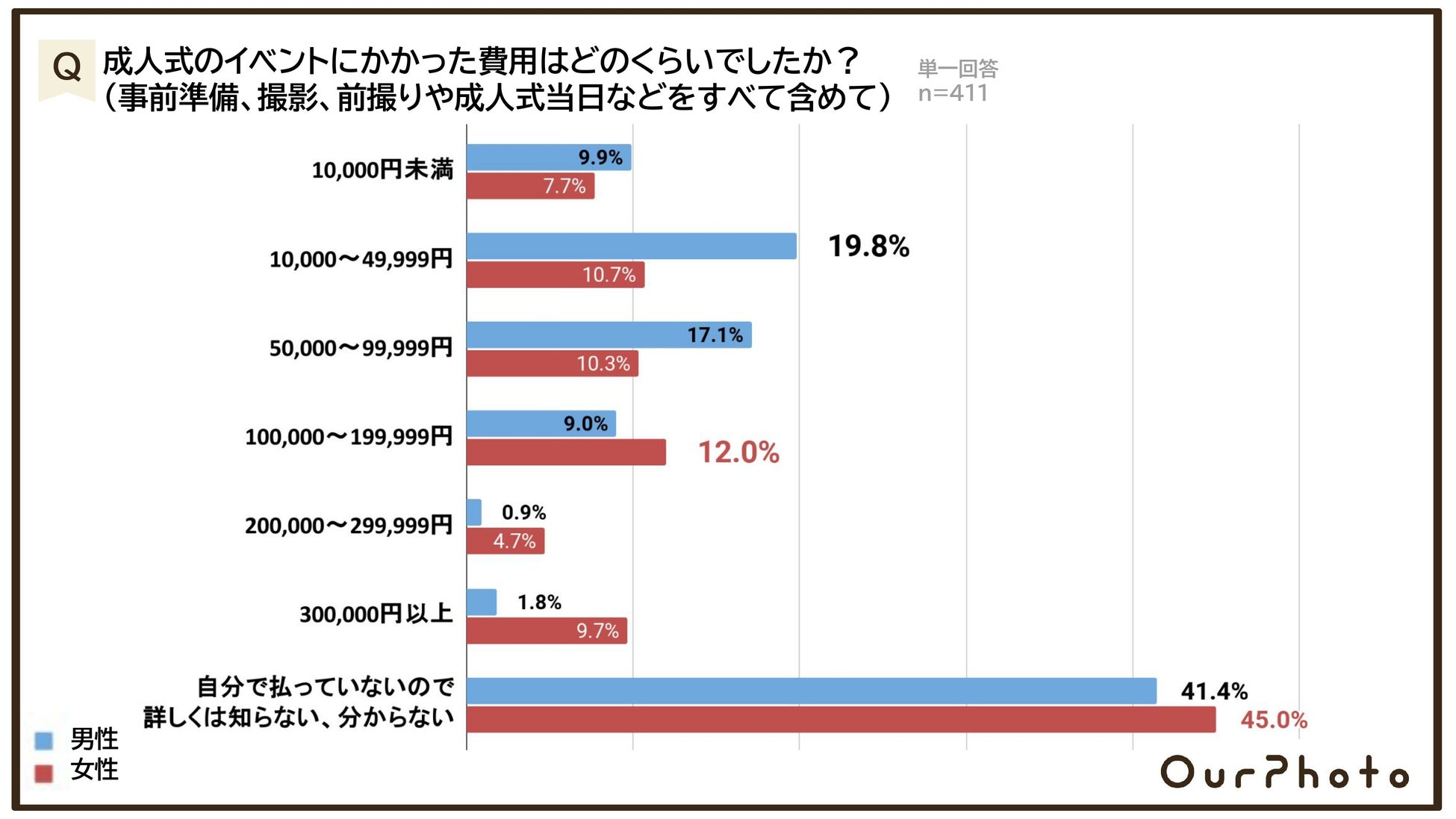 また、費用面でも男女間に大きな違いが見られ、女性は「100,000~199,999円」(12.0%)が最多だったのに対し、男性は「10,000~49,999円」(19.8%)が最も多いという結果になりました。
