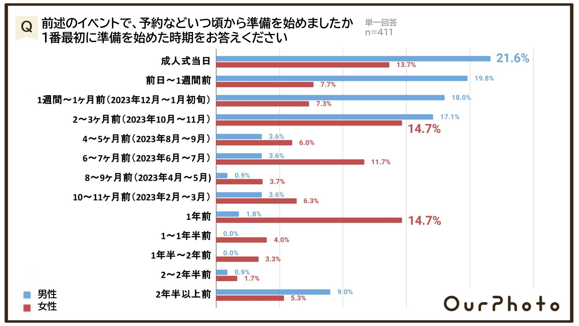 成人式を迎えるにあたって実施したイベントの準備や予約などをいつ頃から始めたか聞いたところ、男性は「成人式当日」(21.6%)が最も多い一方で、女性では「2~3ヶ月前(2023年10月~11月)」「1年前」(14.7%)が最多で、準備開始時期に男女で大きな差が見られました。