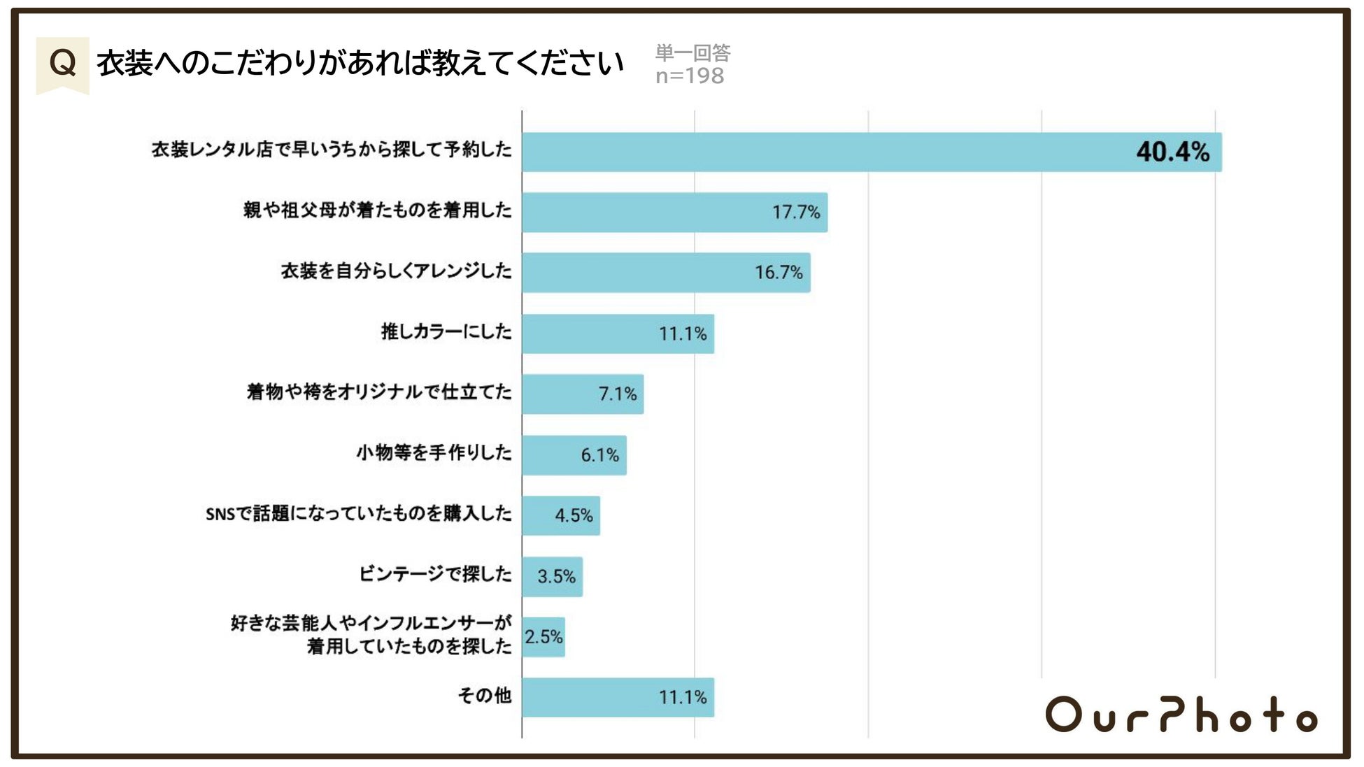 衣装のこだわりは「衣装レンタル店で早いうちから探して予約した」が最も多く4割(40.4%)という結果。また、「推しカラーにした」と回答した方は11.1%で、前年から3.7ポイント増加。<結果6>