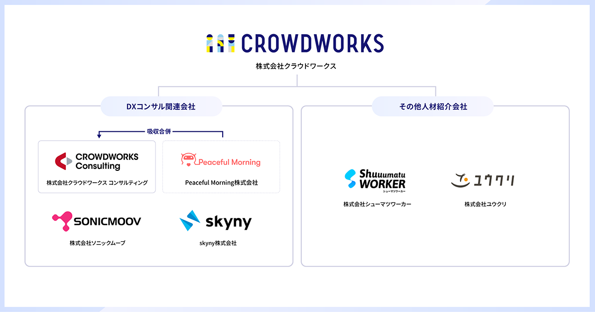 フリーランス業界最大級プラットフォーム(登録ワーカー含む登録ユーザー数700万人・登録企業100万社)(*1)を基盤に、IT人材&DXコンサルティングサービスを提供する株式会社クラウドワークス(本社:東京都港区 代表取締役社長 兼 CEO:吉田 浩一郎 以下「当社」)は、当社のグループ会社である株式会社クラウドワークス コンサルティング(本社:東京都港区 代表取締役:大類 光一 以下「CWC社」)とPeaceful Morning株式会社(本社:東京都港区 代表取締役社長:前田 悠貴 以下「PM社」)を経営統合(以下「本統合」)することを、2026年2月27日開催の取締役会において決議いたしました。本統合は2026年5月1日を効力発生日(予定)とし、CWC社を存続会社、PM社を消滅会社とする吸収合併方式により行います。