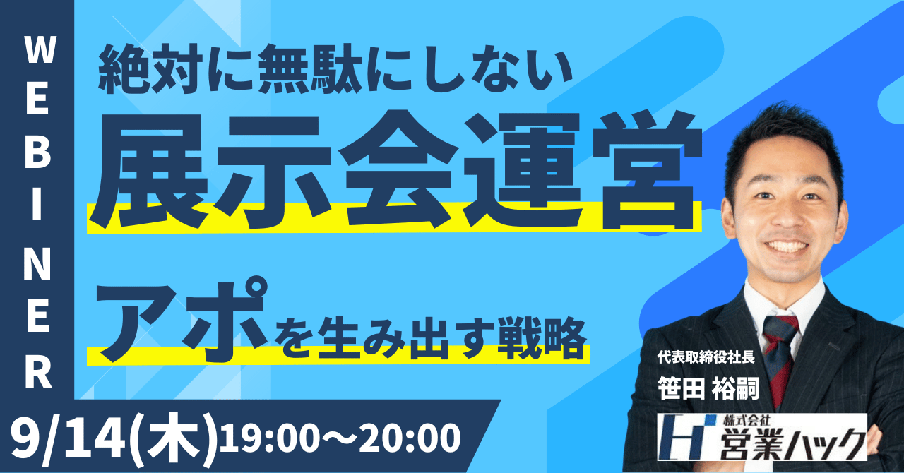 【せっかくの展示会出展を無駄にしない!】展示会・ウェビナーからのアポ率を最大化する秘訣をお伝えします《9/14(木)19:00~無料オンラインセミナー》